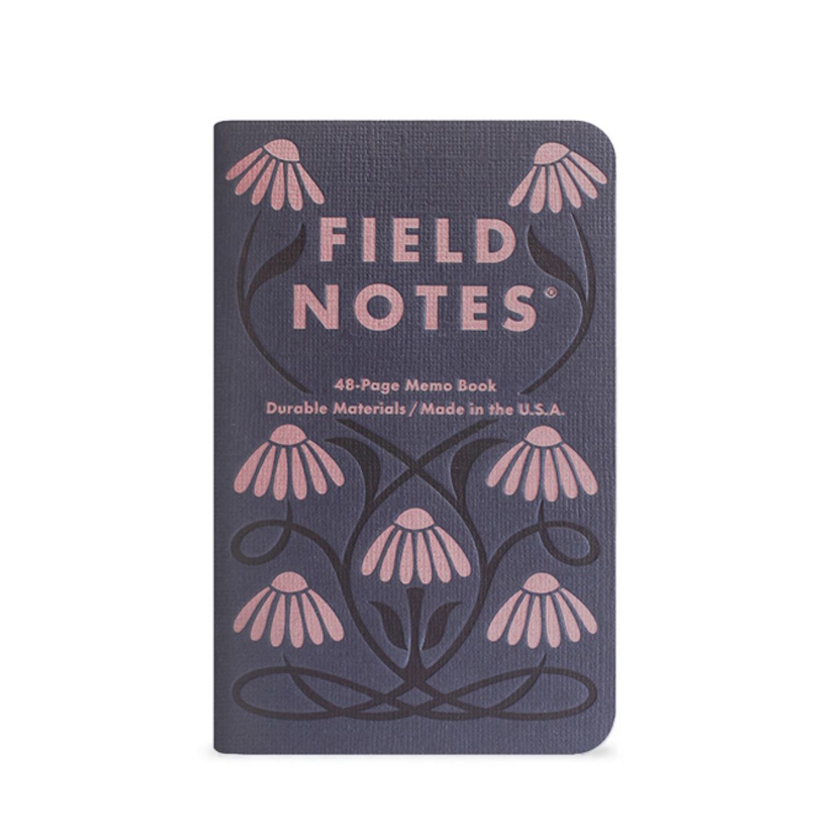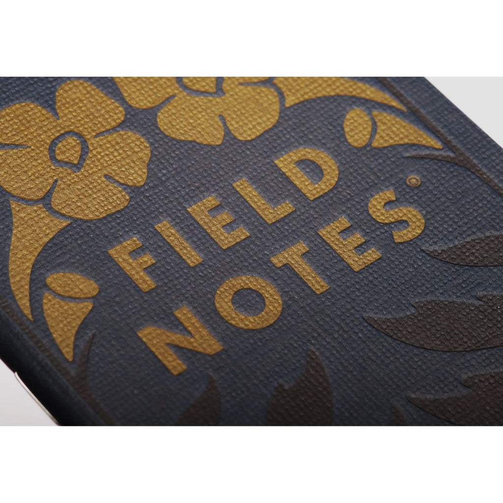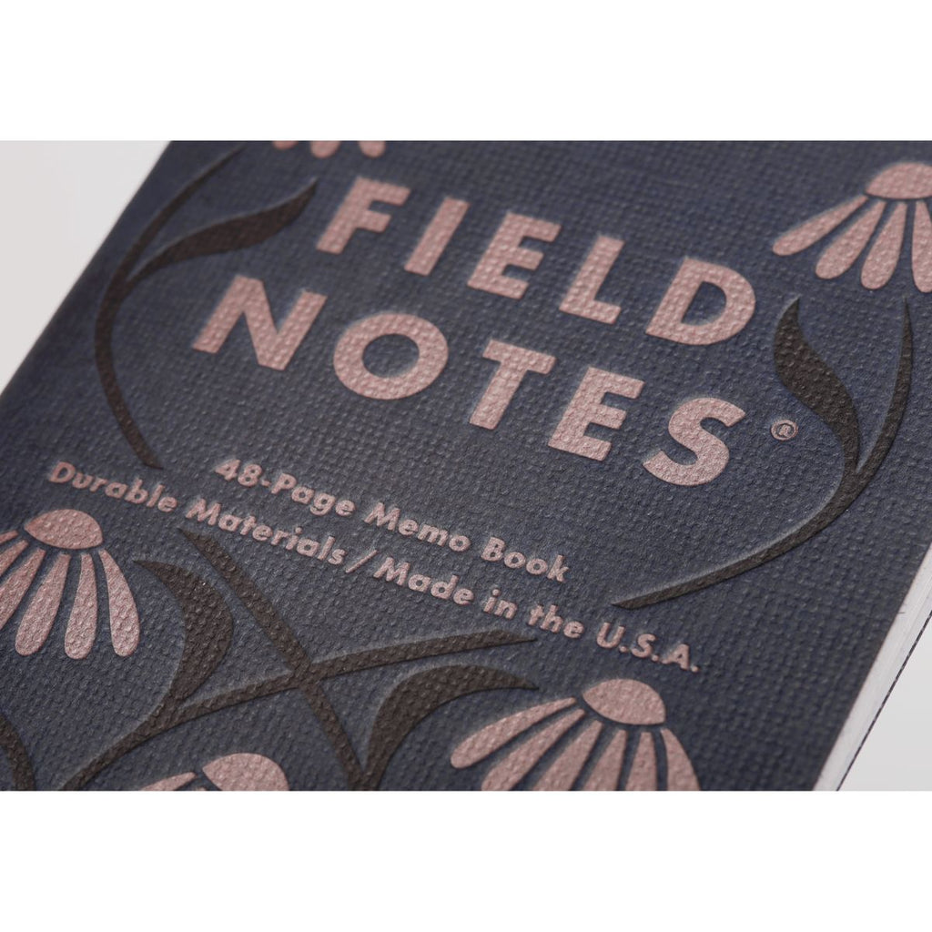 Field Notes’ 68th Quarterly Edition, Fall Flowers, shines a light on three hardy blooms that keep their colour long after summer fades: the purple coneflower, false foxglove, and common chicory. Each memo book is wrapped in midnight blue “burlap” stock, with illustrations pressed in shimmering metallic inks—mauve, gold, and silver—that gleam beautifully against the textured surface. The style nods to early 20th-century book bindings, giving the set the air of antique cloth volumes you might find on a well-worn library shelf.