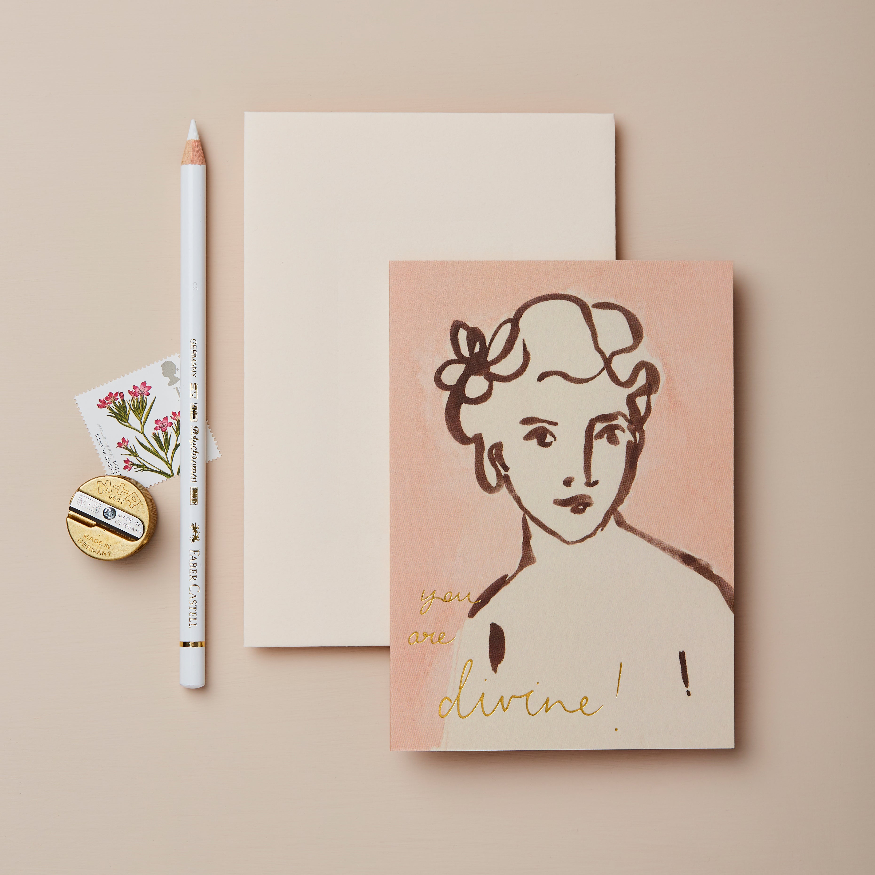 Part of the 'Our Portrait' collection, this is a beautifully designed card which reads 'You Are Divine' and features a painterly illustration of a face with a flower in her hair.