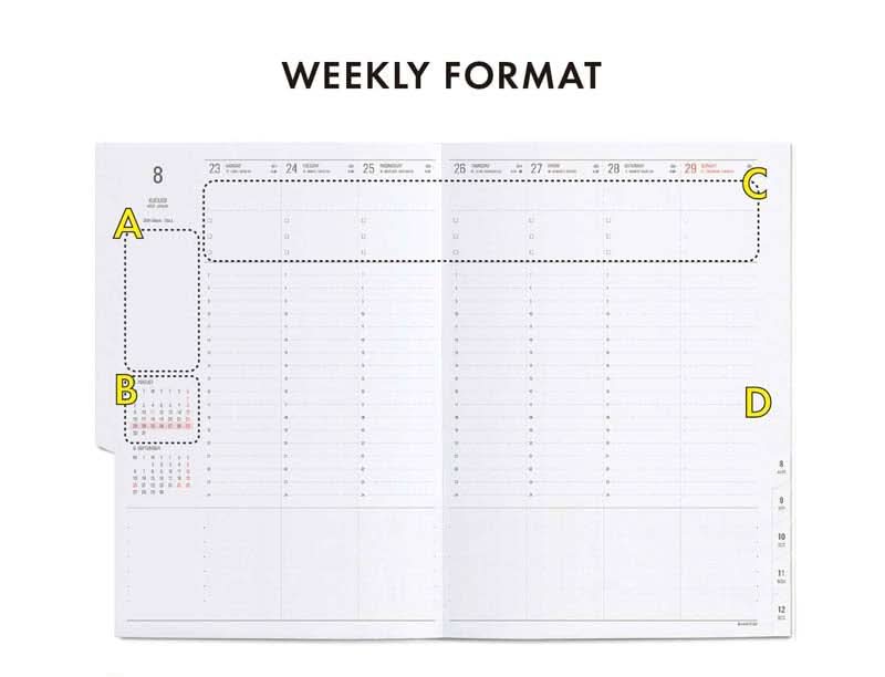 Content: (calendar, annual schedule, monthly schedule, weekly schedule, notes, personal data, monthly index)