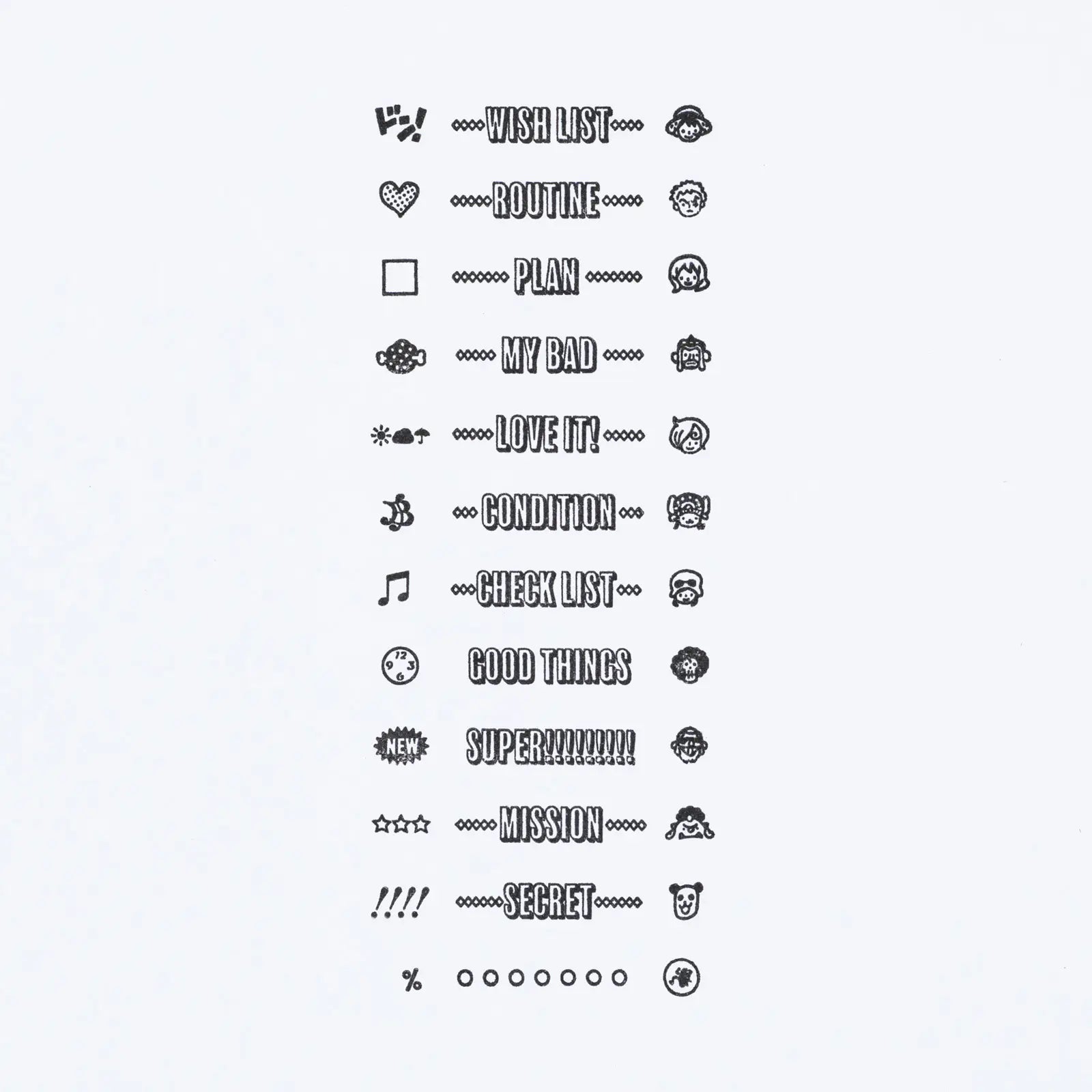 Try using the row of seven circles as a habit tracker, or stamp the sun and cloud symbols to record the weather. Mix and match the icons and words to create combinations that suit your own unique style!