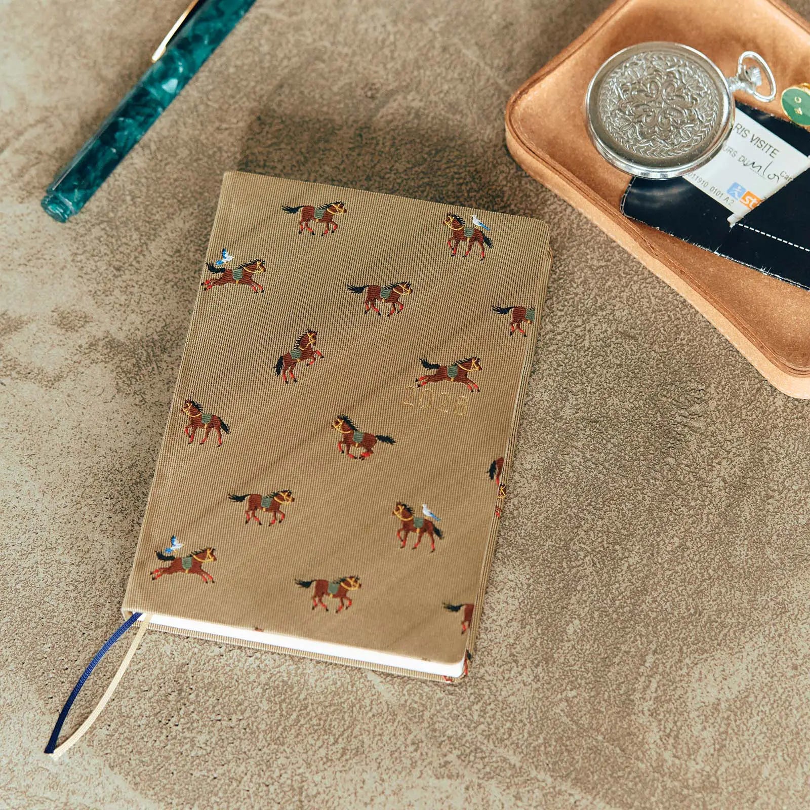 The Bow & Tie series is covered with the same textured, shiny fabric used in neckties. The material has a beautiful gloss and is soft to the touch. On this Galloping Horses cover, a variety of horses—some galloping, some walking—are woven into a chic beige background. The horses spending their time in leisure are depicted in fine detail through the intricate weave of necktie fabric.