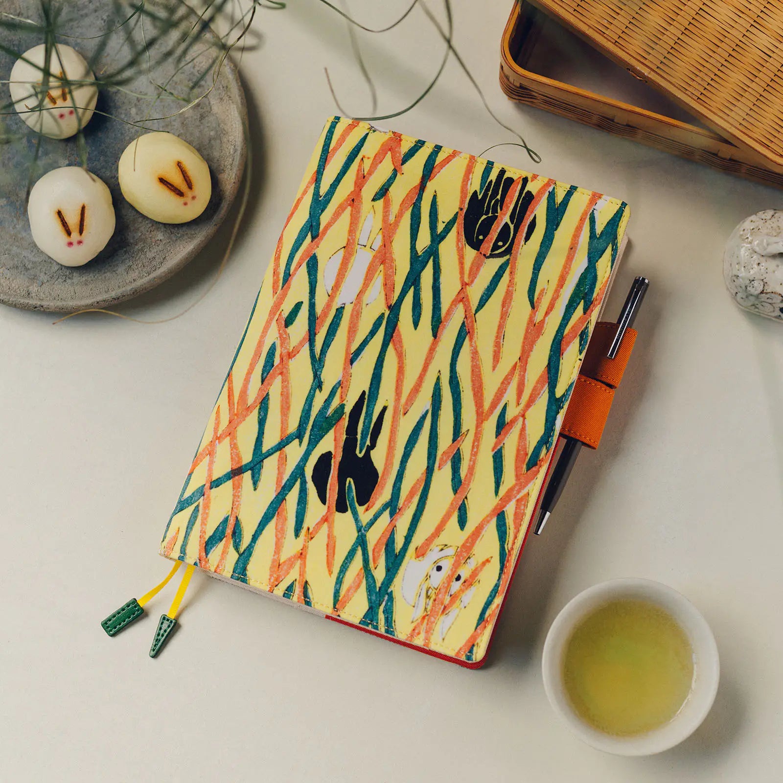 The “butterfly-stopper” pen holders and bookmark charms are coloured to echo the plants and flowers featured in each design. The inner cover is a calming, soft beige.