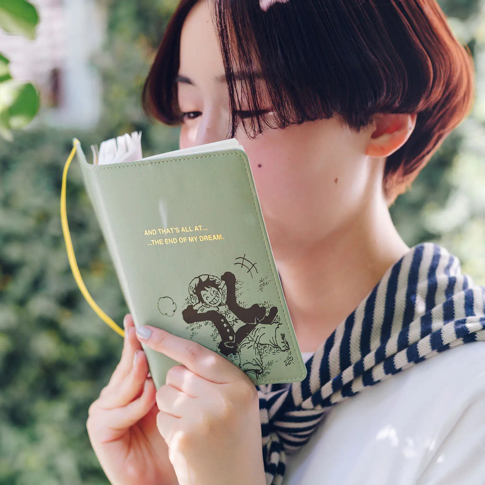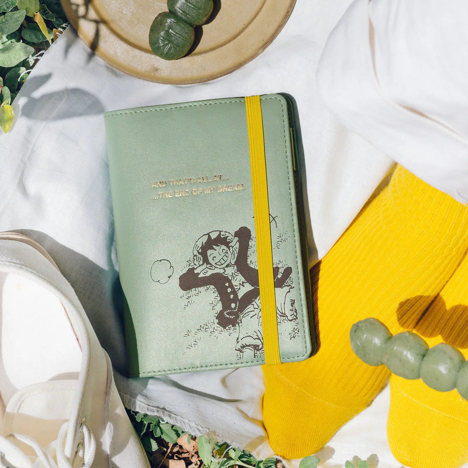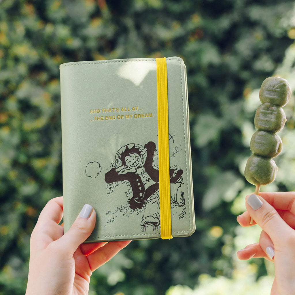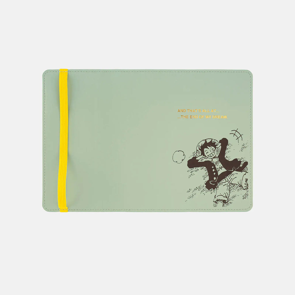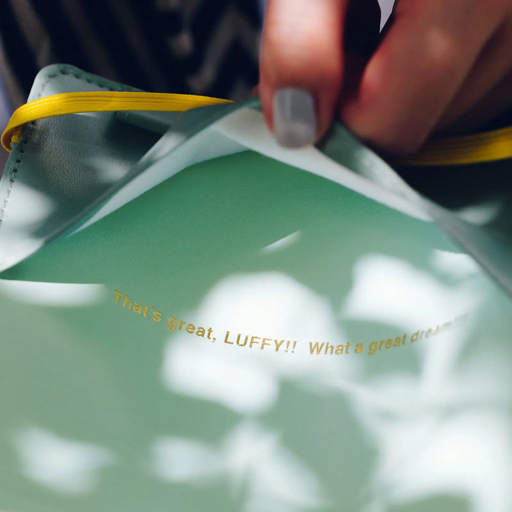 A cover in collaboration with ONE PIECE magazine, a publication which dives deep into the world of the manga One Piece. “Hee Hee Hee!!”—Luffy is lounging on the grass and laughing giddily in this print on a soft, mint green faux leather. The elastic band closure makes for a casual and compact cover that you can easily take with you on the go.