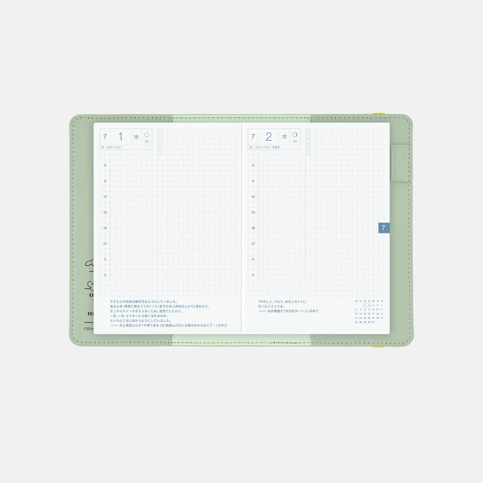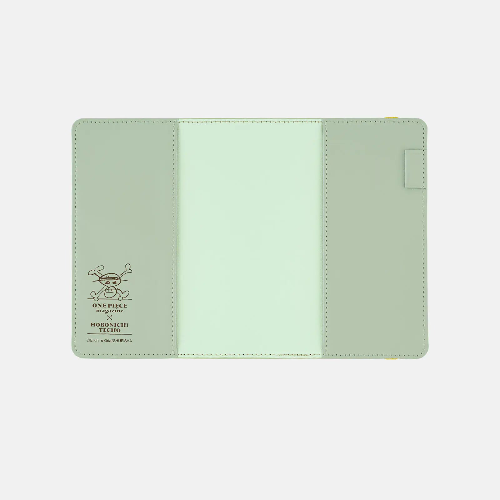 The interior comes in a blue-hued peppermint green. The left includes a collaborative logo of the ONE PIECE magazine and the Hobonichi Techo.
