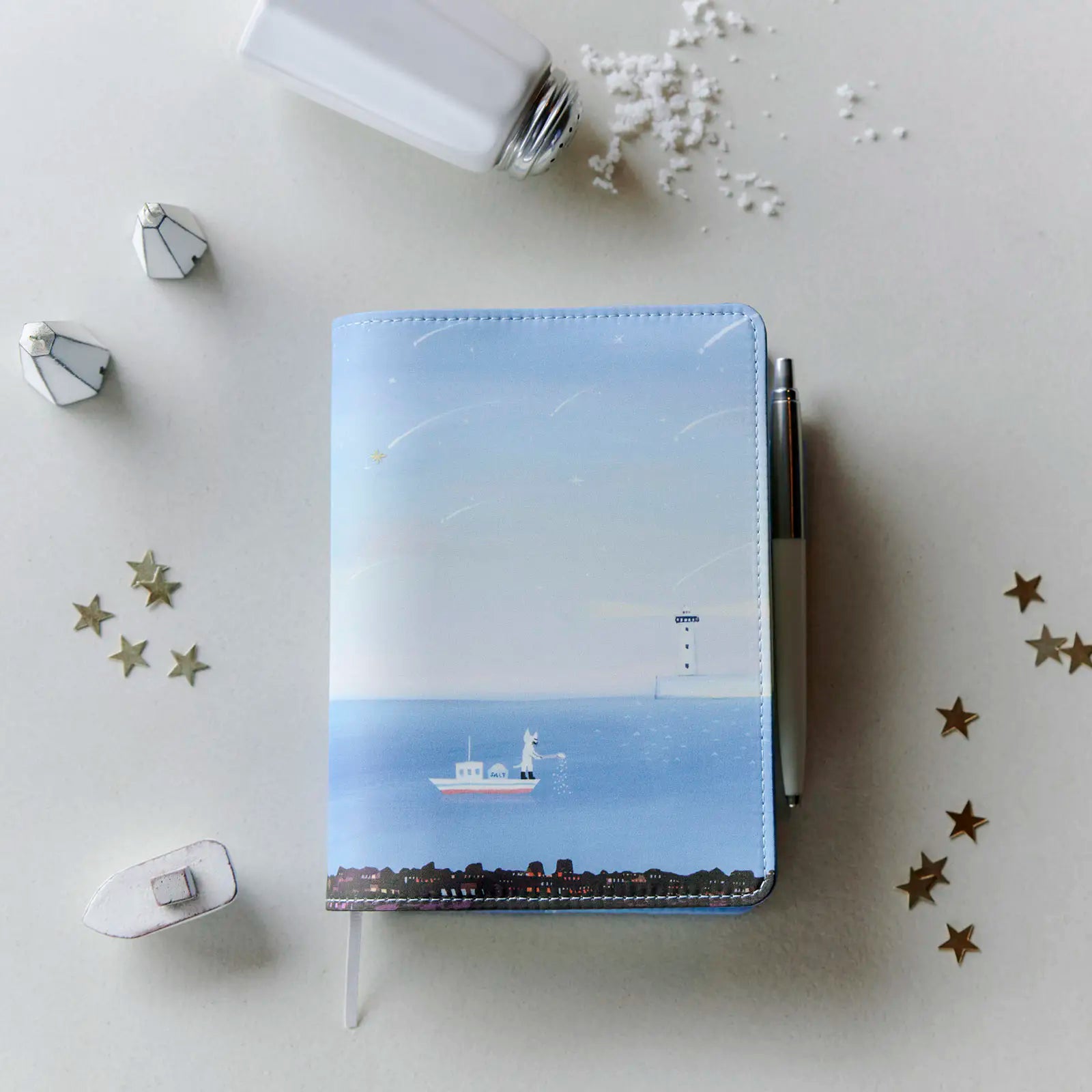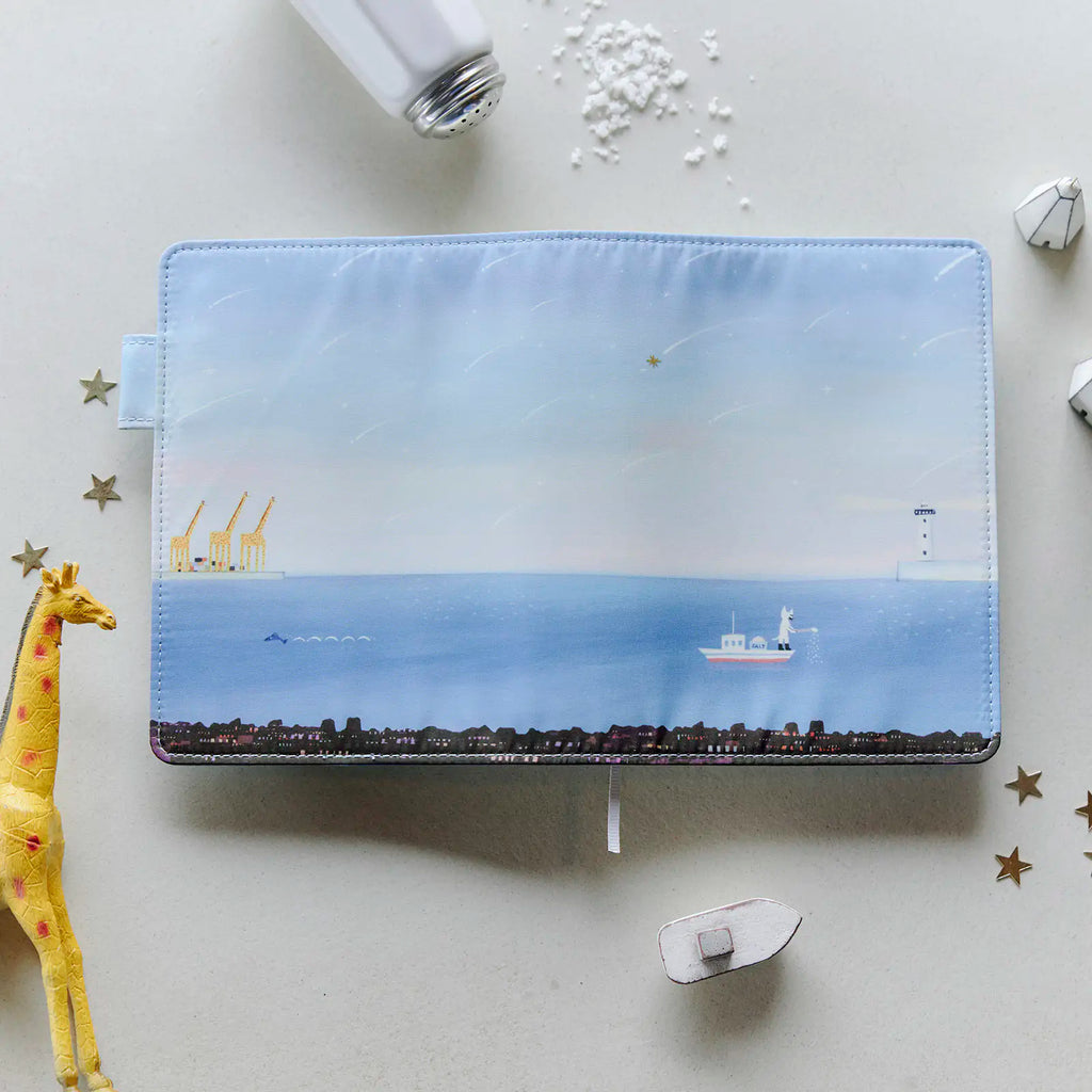The sky and sea expand into the interior of the cover. The bookmark is in a pale gray with a muted shine, blending into the quiet scenery. The pen hook on the inside lets you store your pen by its clip, while still maintaining the cover’s clean, refined silhouette when closed.