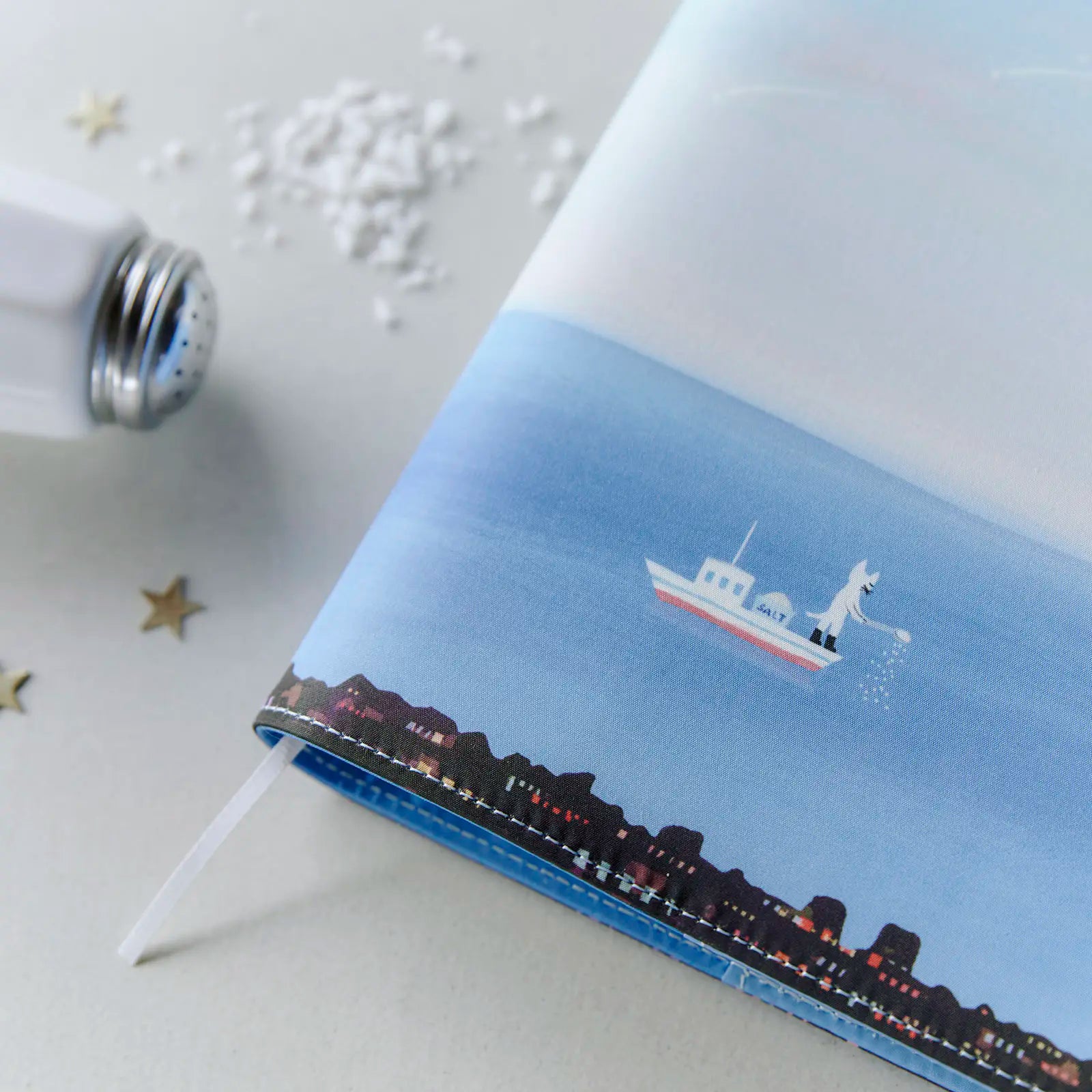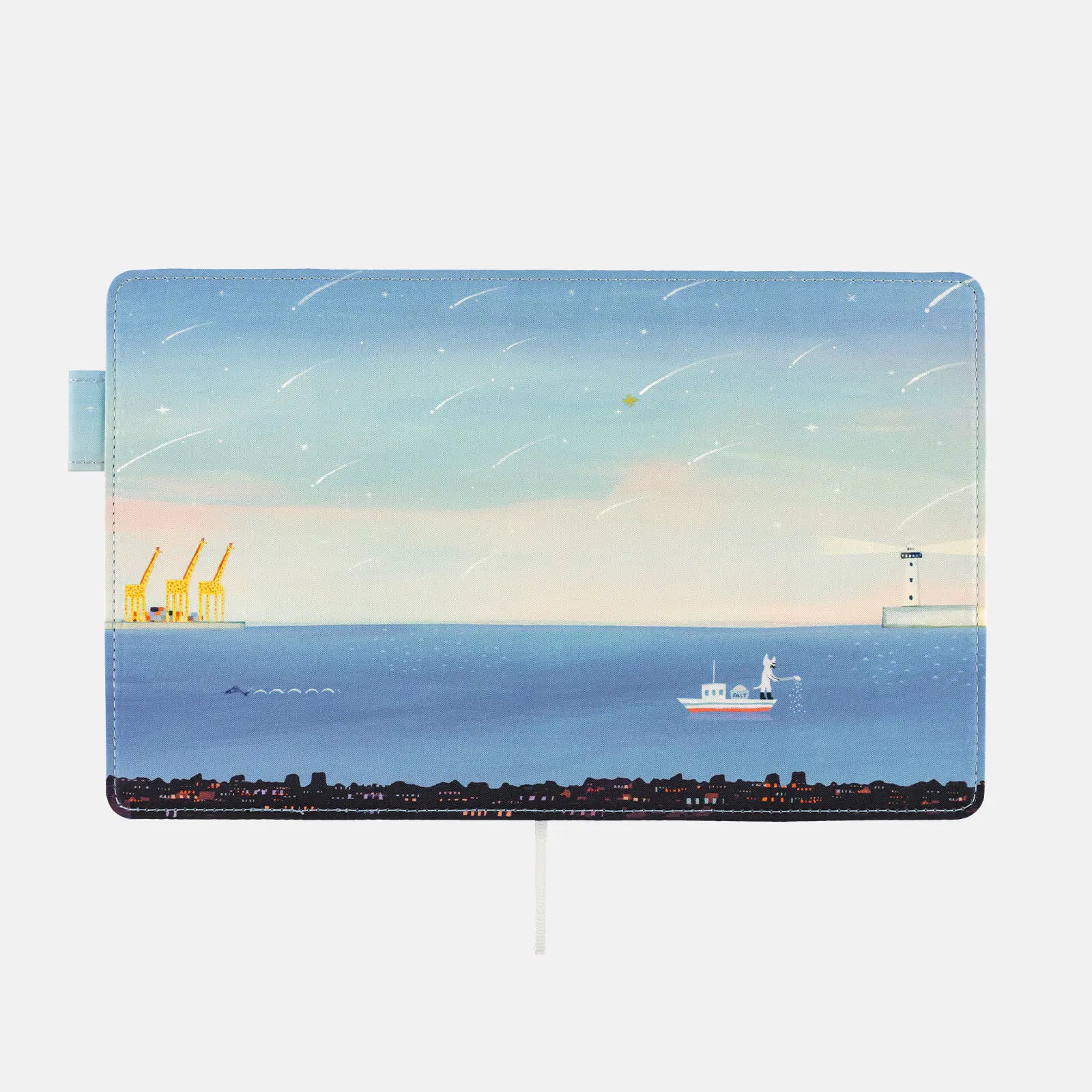 As sugar-grain meteors fall from the pale blue sky, the cat on the boat starts adjusting the salt levels. The lighthouse beats a steady rhythm of light, while flying fish stitch new seams across the waves. The giraffe-like gantry cranes gather for a waterside chat, occasionally letting out a yawn. This cover captures a mysterious moment at dawn, one that is only known to the sea.