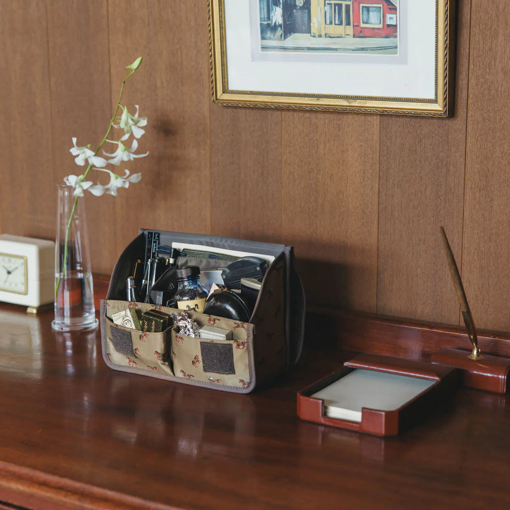 The interior also has pockets of various sizes that can store items based on their size and shape. The largest pocket is long enough to hold a memo pad or ruler. The small pocket can store sticky notes, cards, stickers, and other slim objects. The left pocket can hold pens.