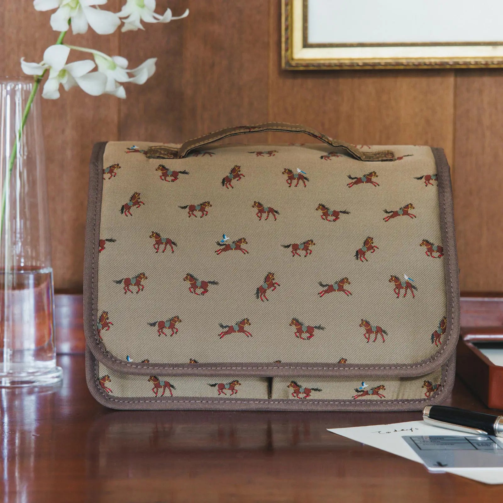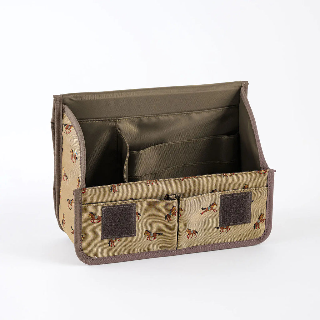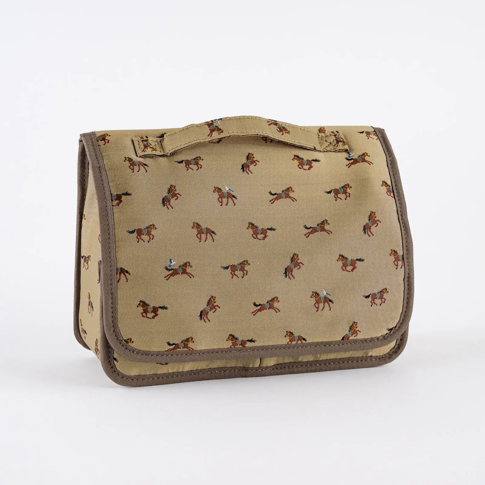 A variety of horses—some galloping, some walking—are woven into a chic beige background, and the flowing manes and tails add a sense of movement and energy. This design is paired with a dark brown interior.