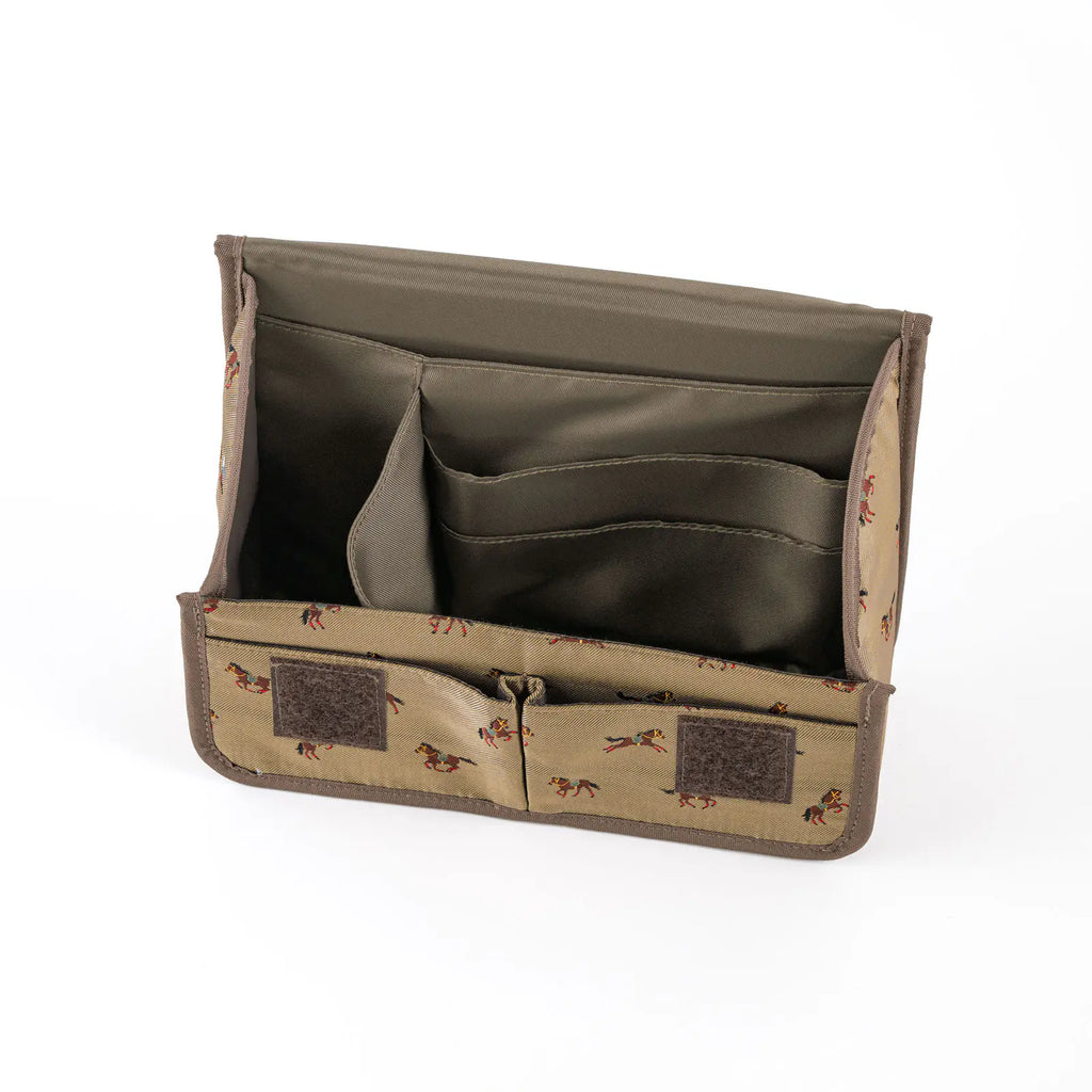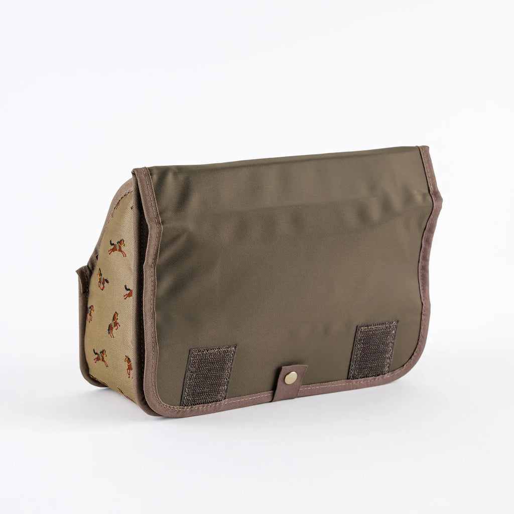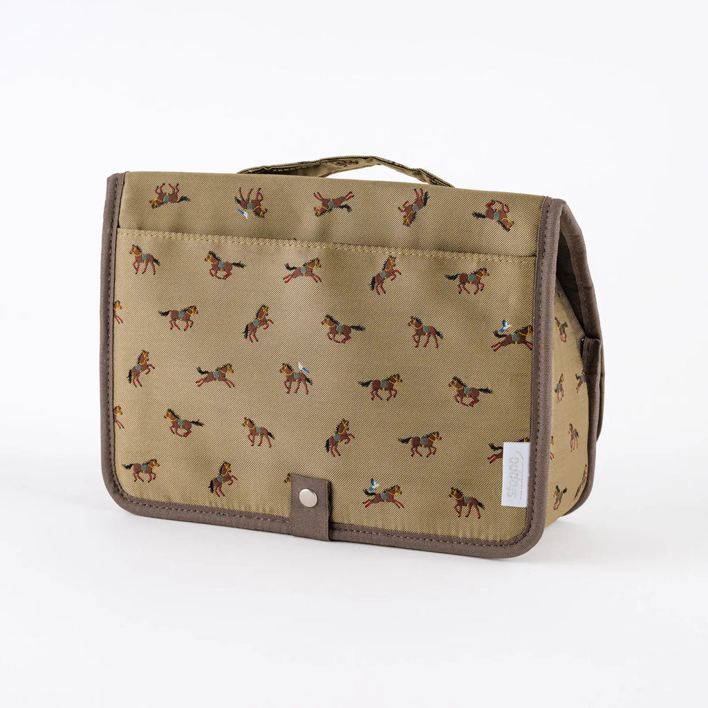 A variety of horses—some galloping, some walking—are woven into a chic beige background, and the flowing manes and tails add a sense of movement and energy. This design is paired with a dark brown interior.
