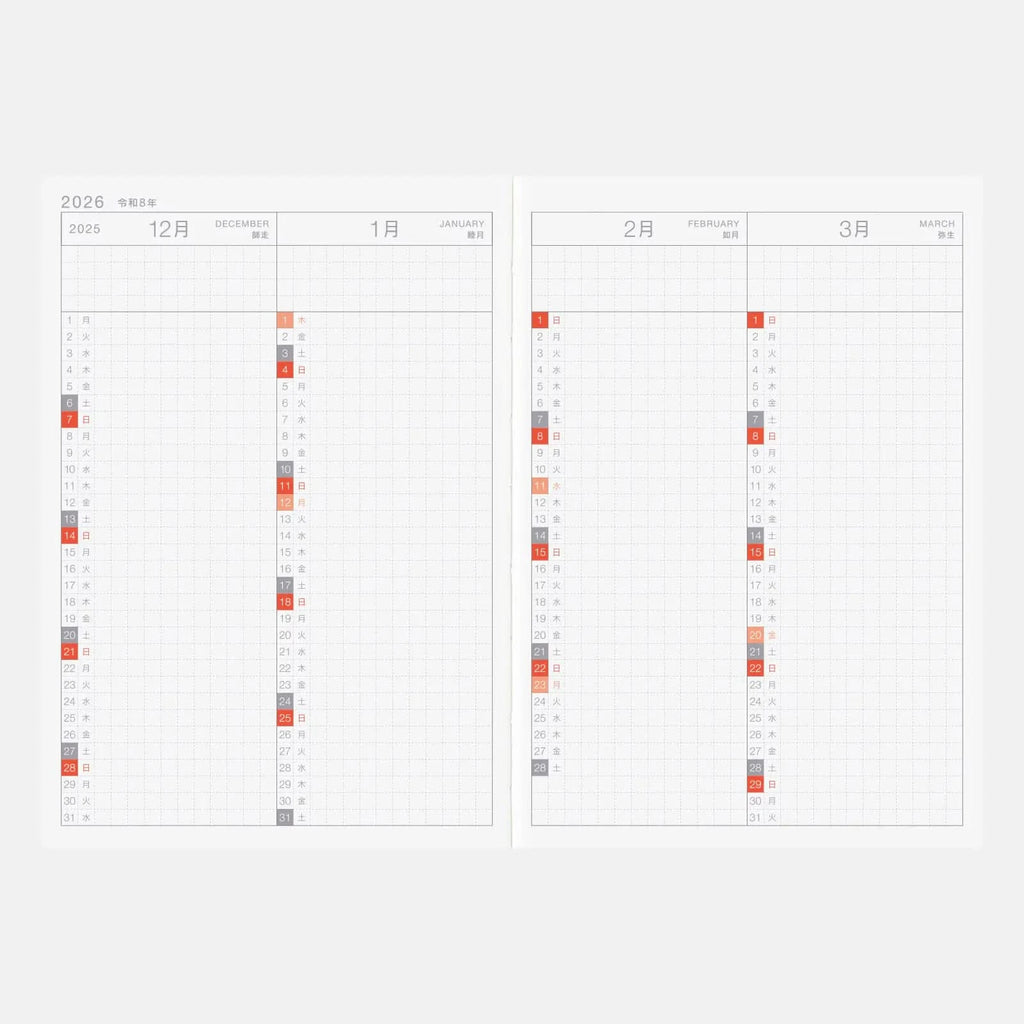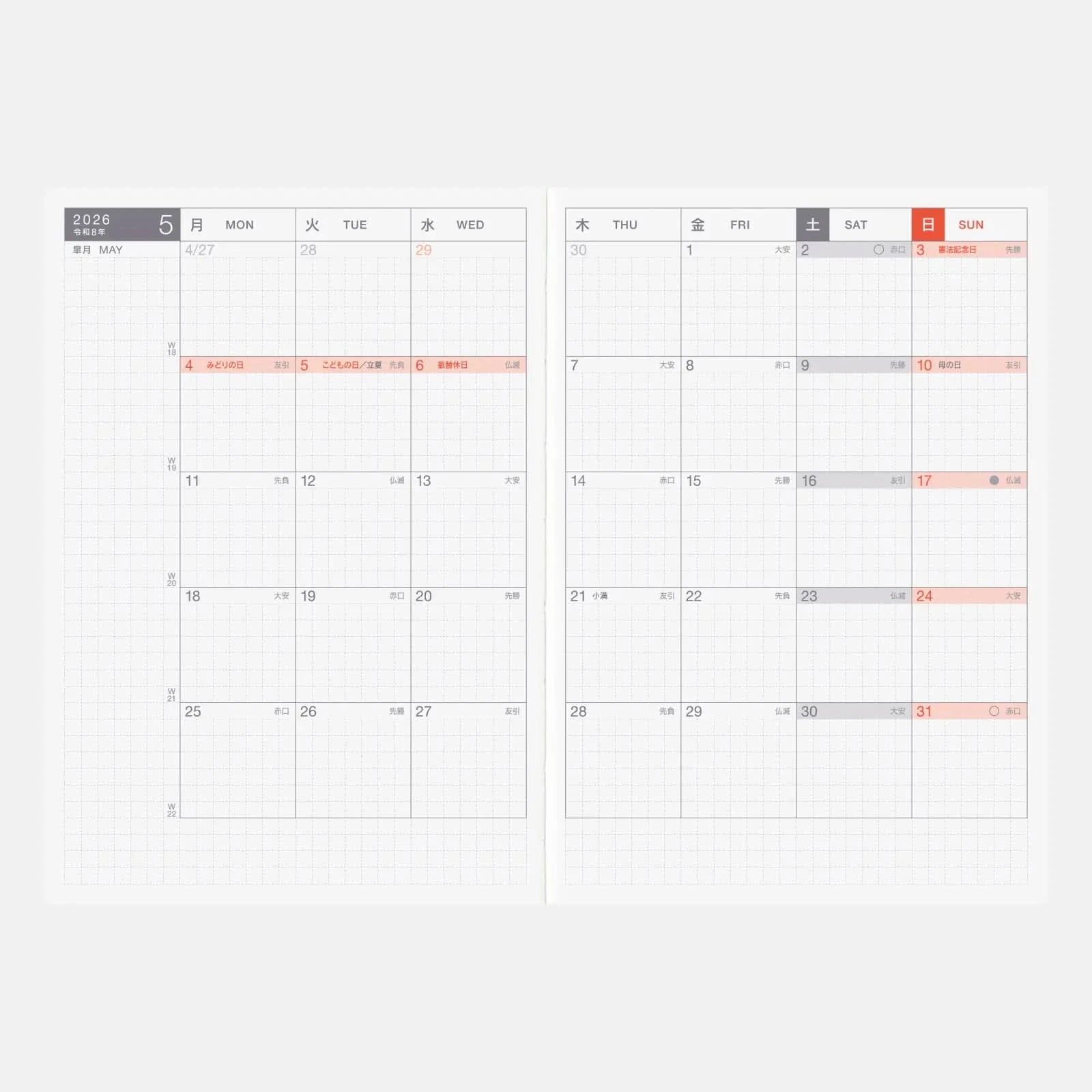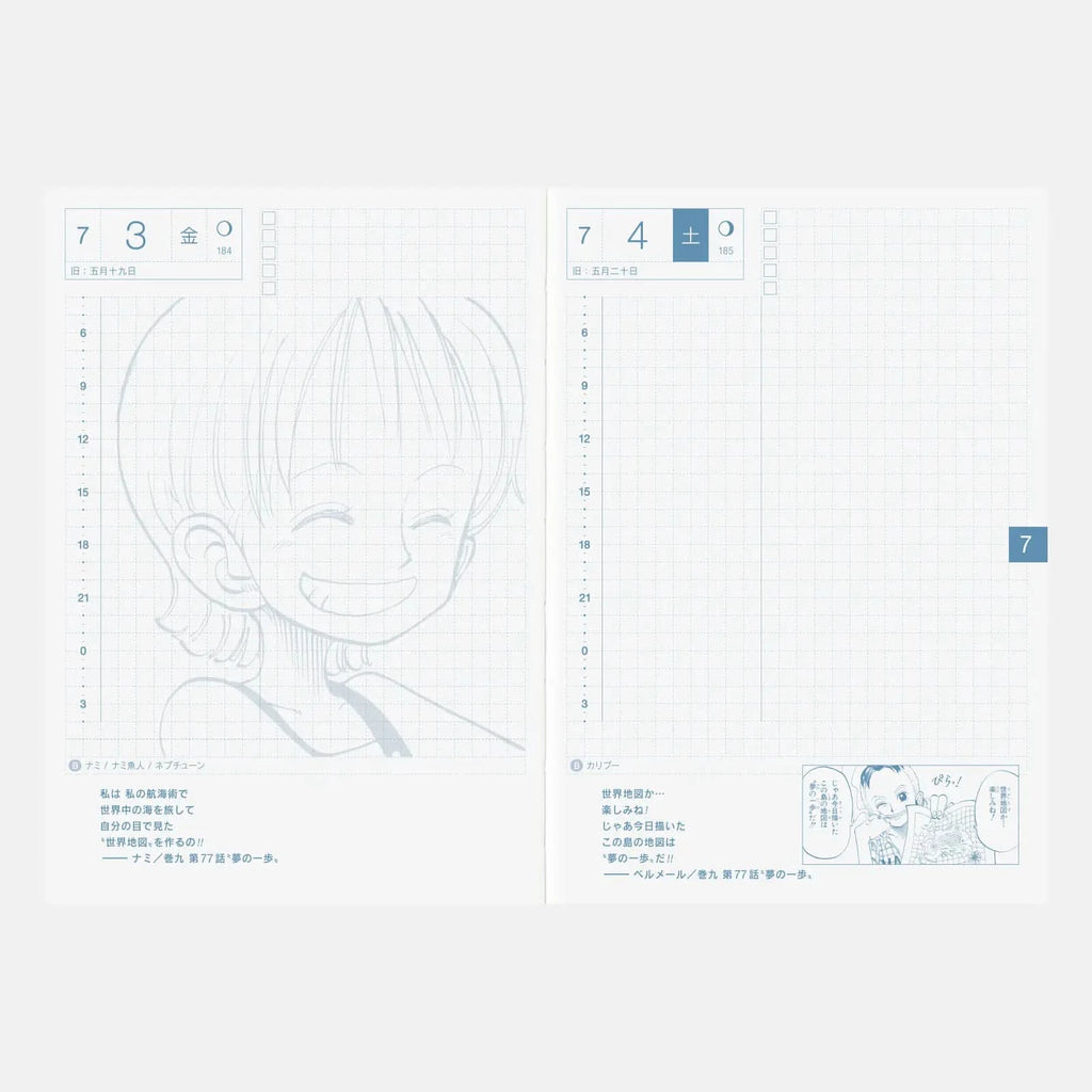 The cover is red in the image of the protagonist Monkey D. Luffy, and designed with an illustration depicting him, as well as the logo of the ONE PIECE magazine. The book’s lay-flat binding and thin and light Tomoe River graph paper with 3.7 mm squares make the book easy to read and write in. The book includes a yearly calendar, yearly index, Monday-start monthly calendars, daily pages, blank memo pages and more.