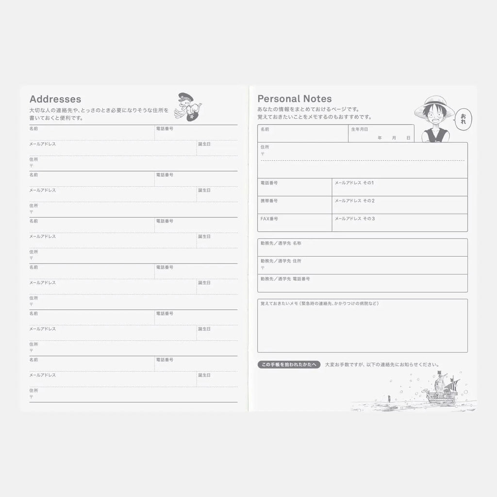 Other additional pages standard to the Hobonichi Techo, such as the Time Table, Favorites, My 100, Solar Terms, Emergency Preparedness, Gifts, Age Table, Addresses, and Personal Notes are also included, but with One Piece themes.