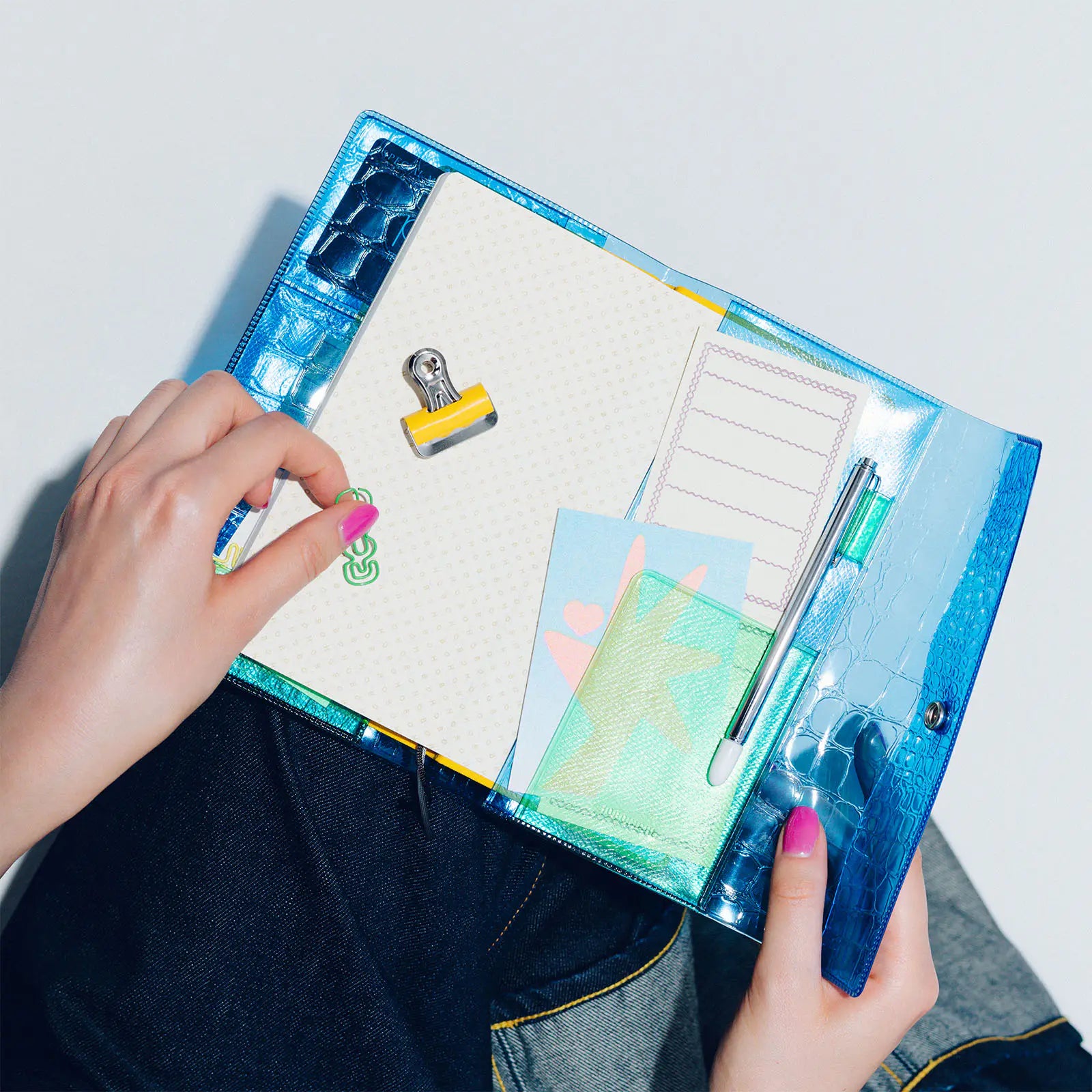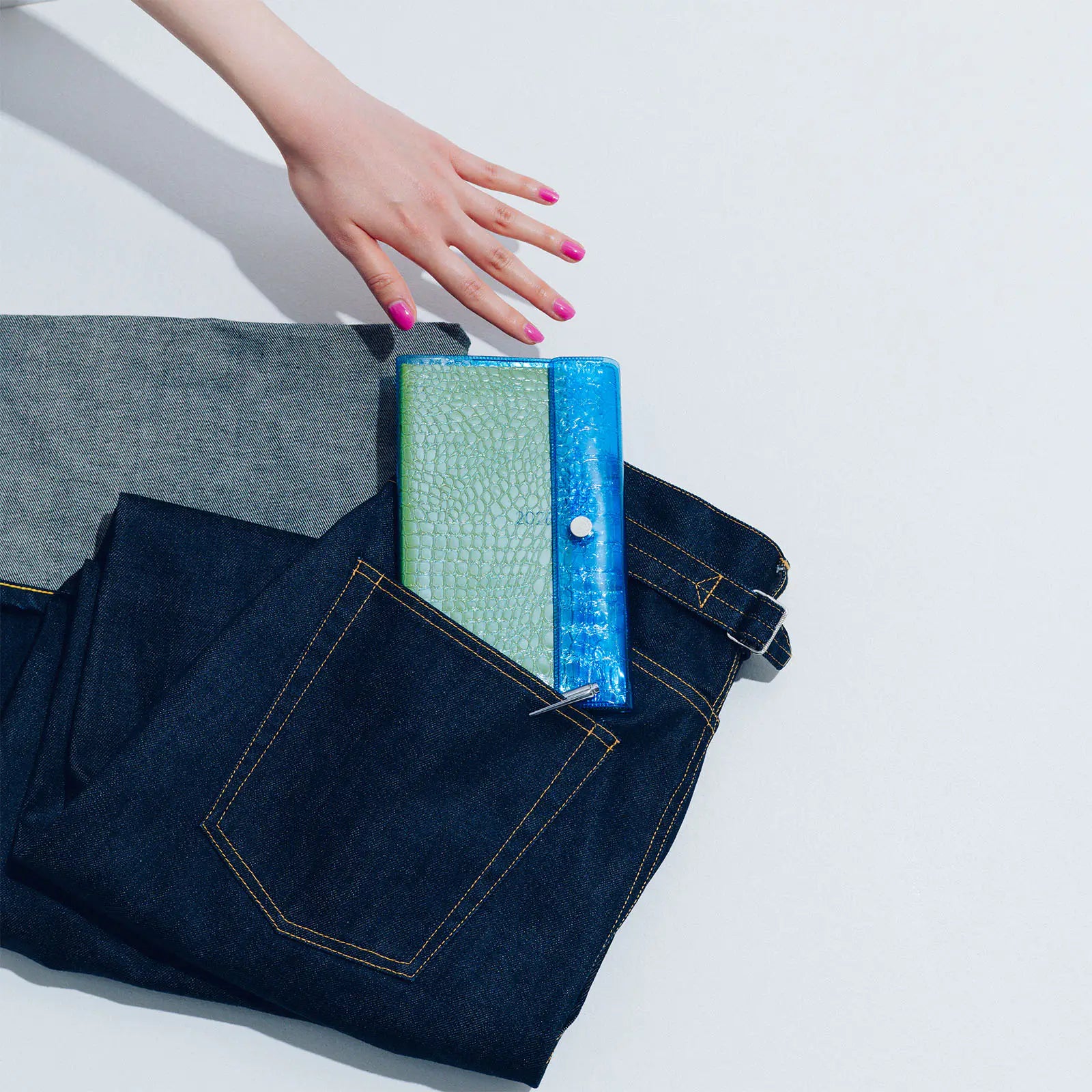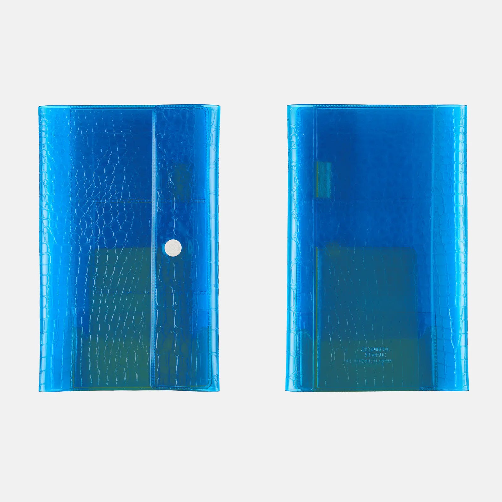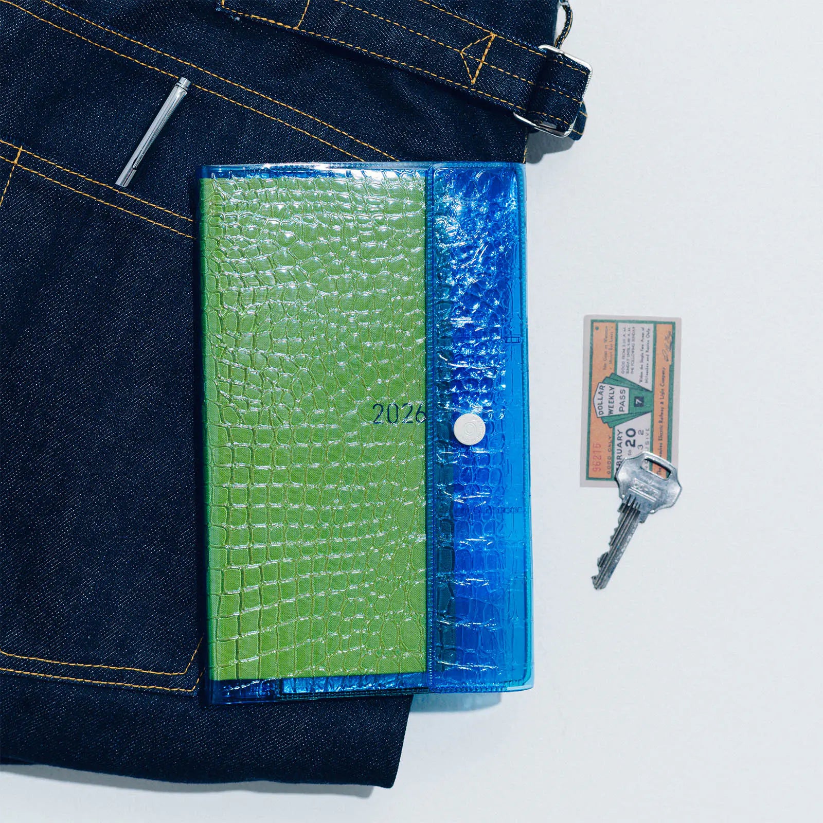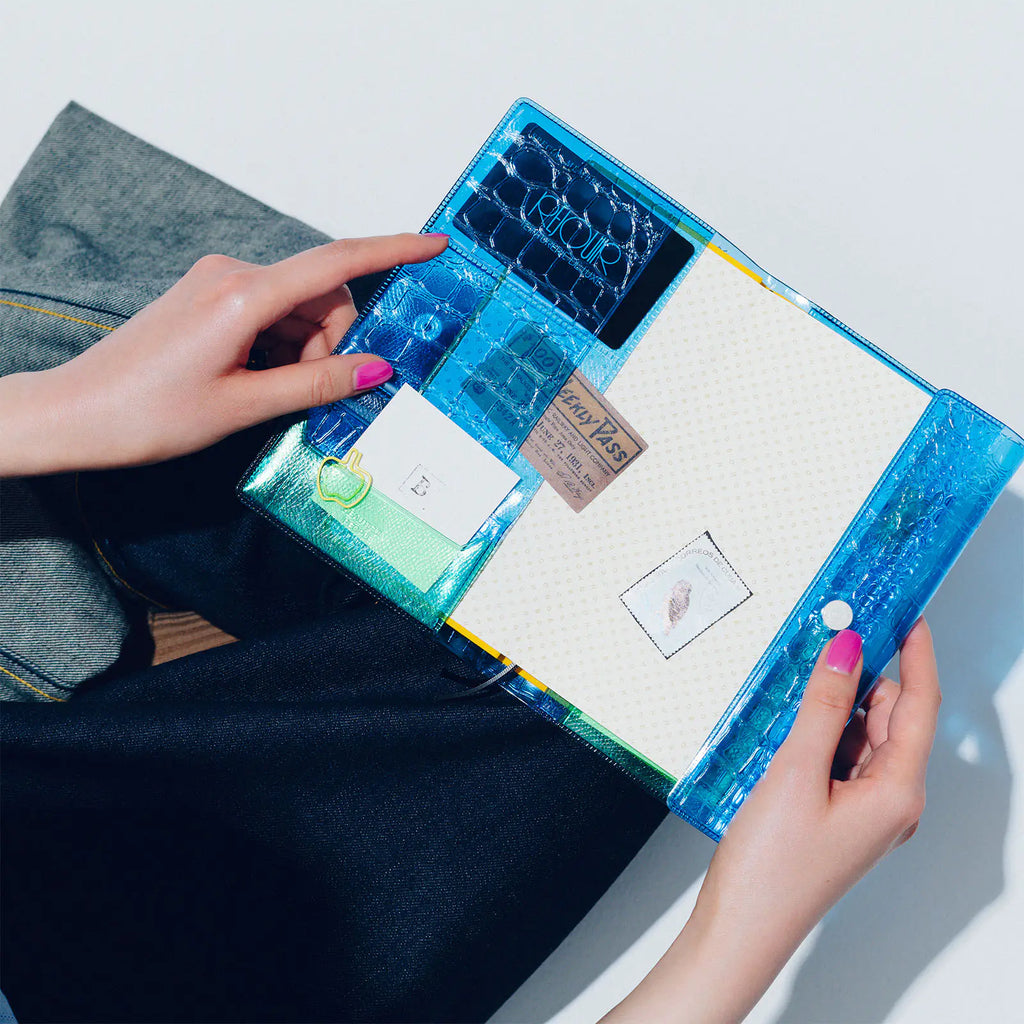 The cover features a crocodile-embossed pattern on PVC. By pairing the transparency of PVC with the embossed texture of natural leather, this design captures beautiful people’s signature sense of playful contrast.