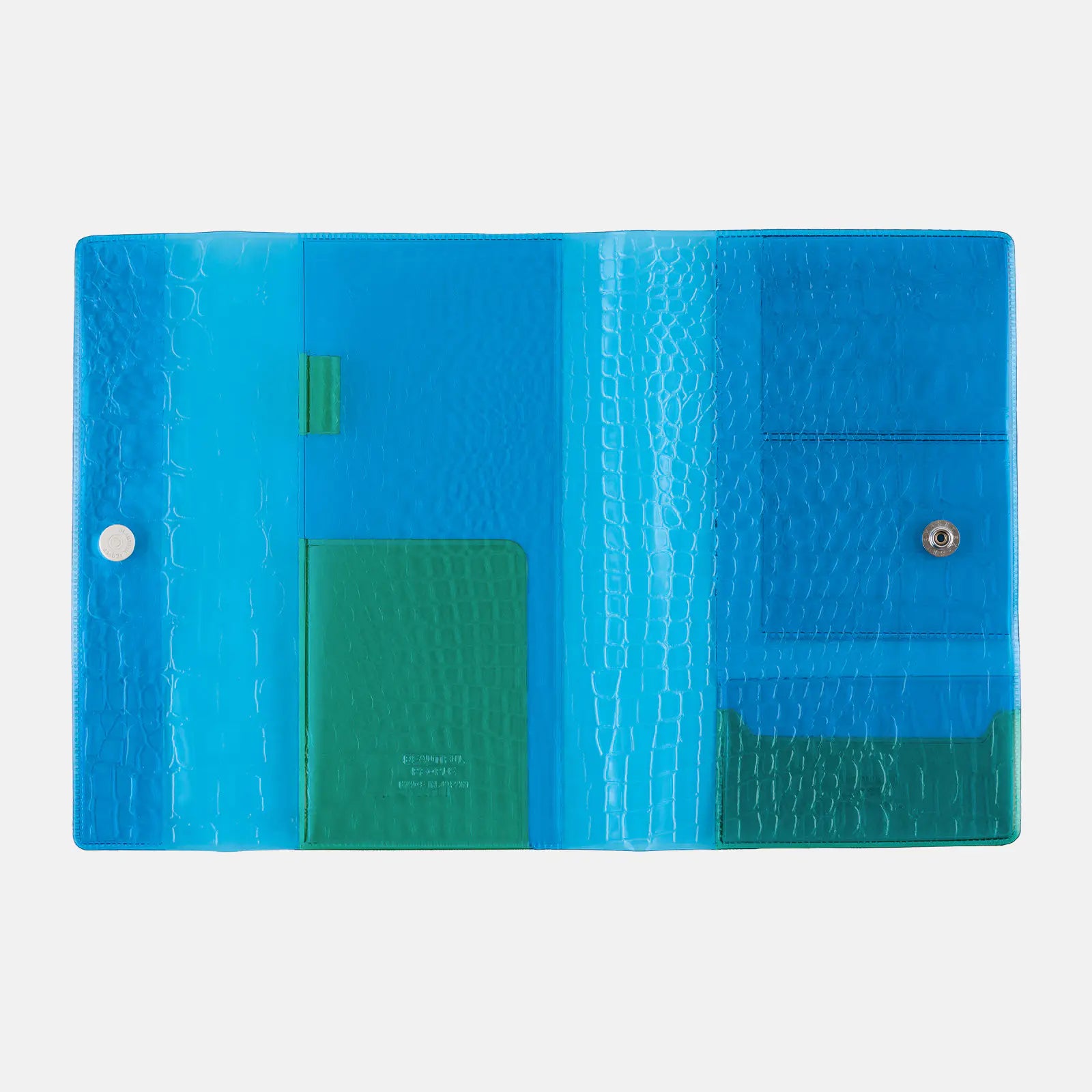 The beautiful people logo is subtly debossed on the back of the cover and on the left interior pocket.