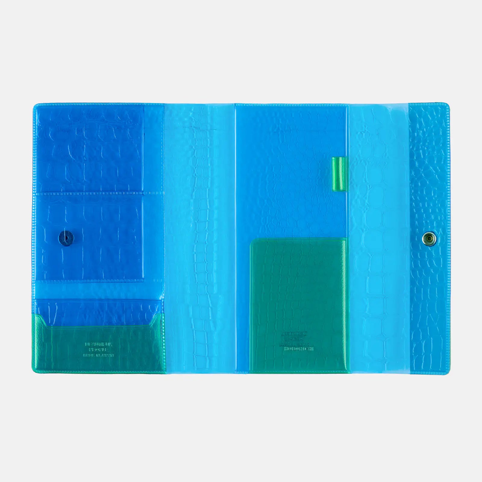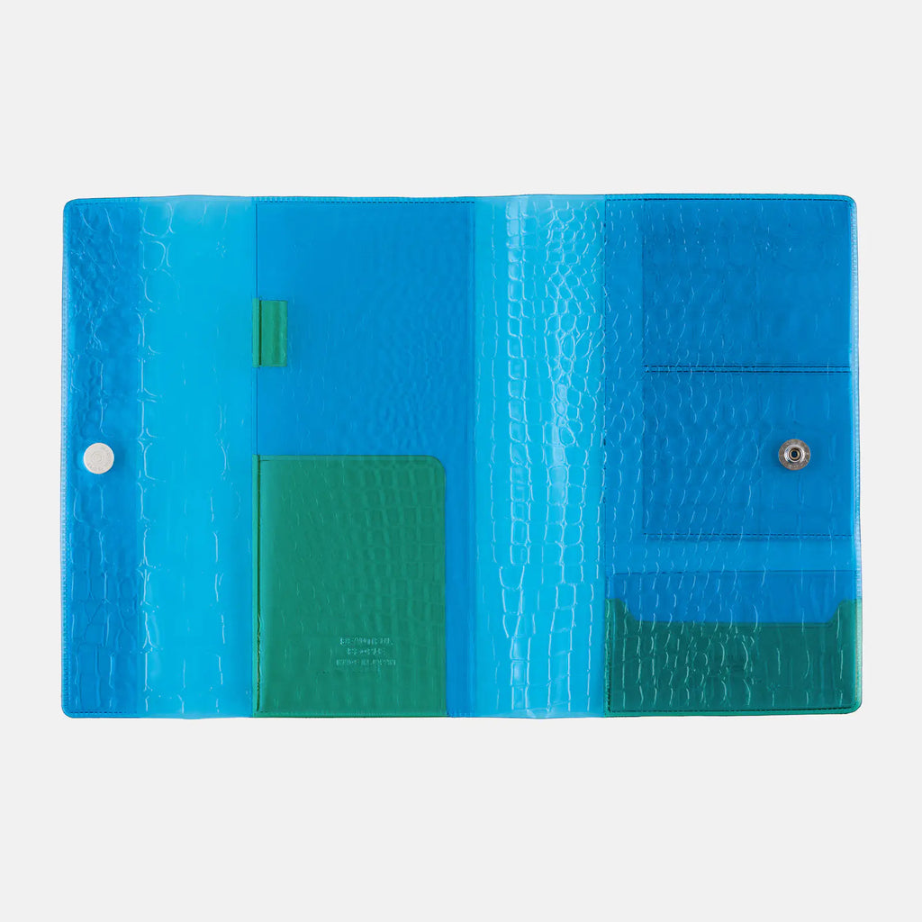 Color-blocked in blue and green, the pocket in green adds a pop of color and is finished with an embossed shrink leather texture. The two colors and patterns overlap to create depth in the design.