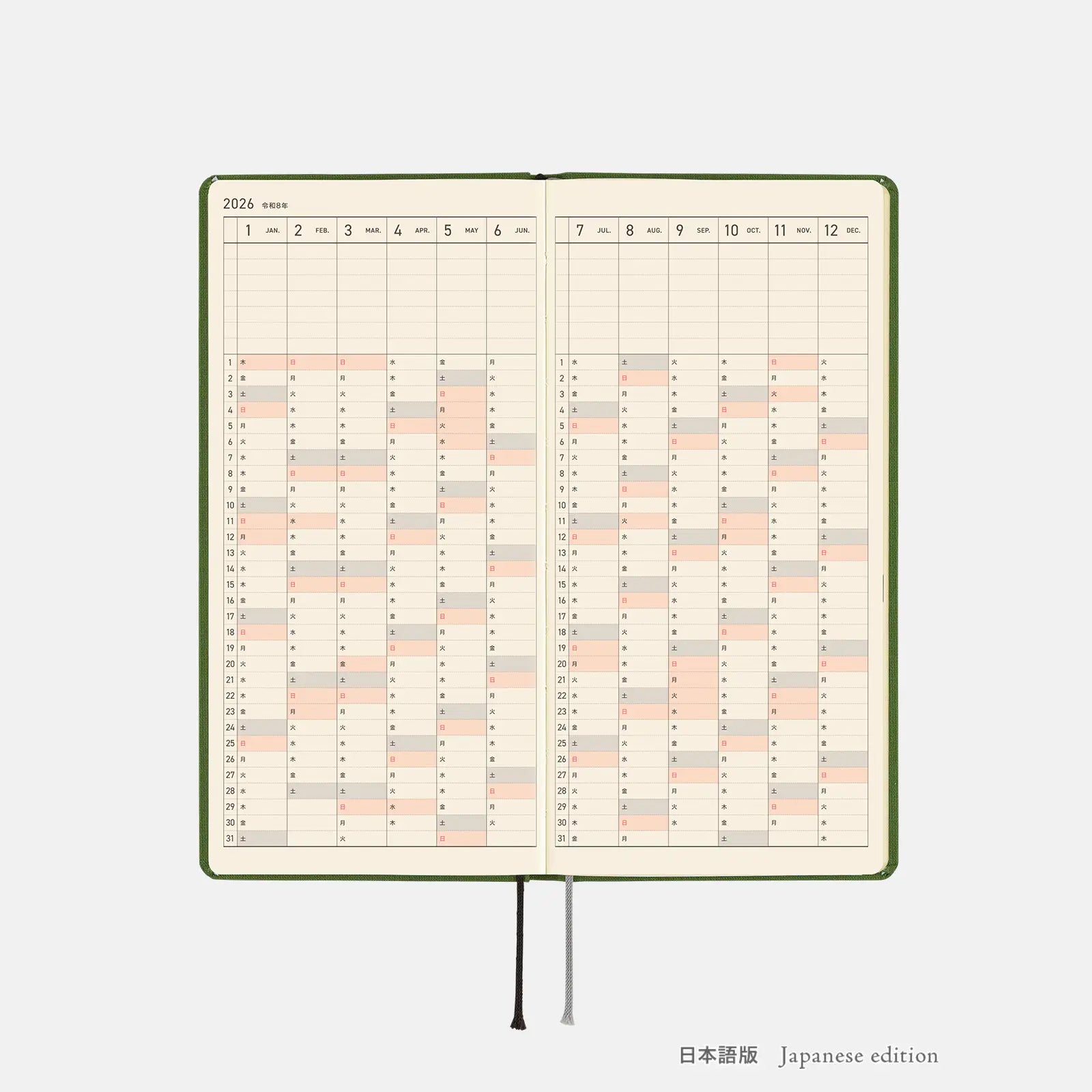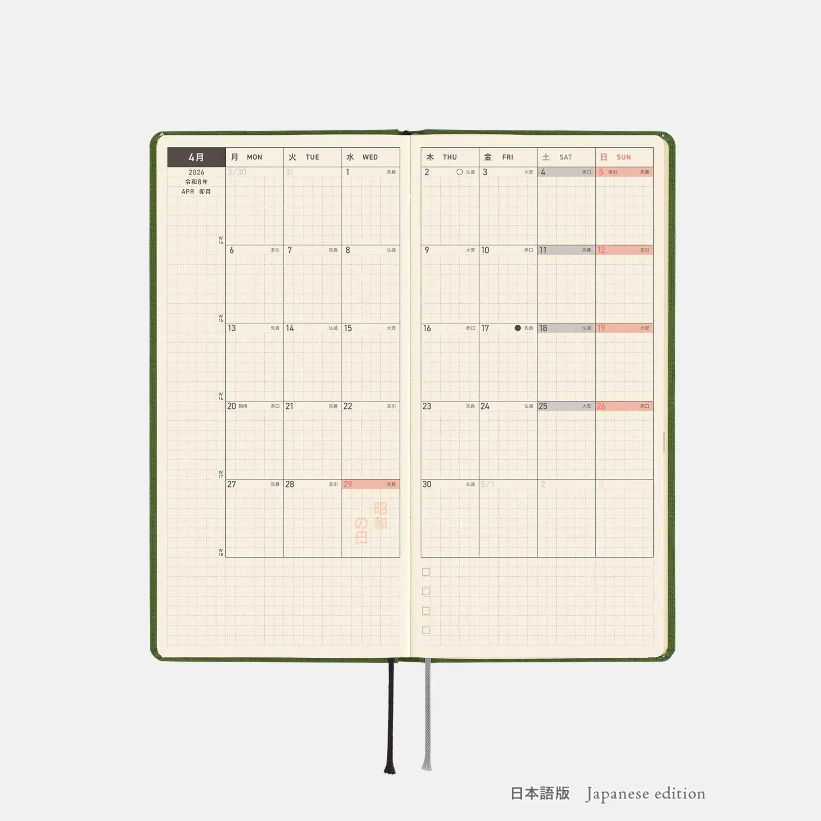 Antique Green is a warm, deep green techo. The gold-foiled 2026 on the front cover evokes the brass detailing on antique furniture, adding a sense of elegance. This Weeks has a timelessly beautiful design.