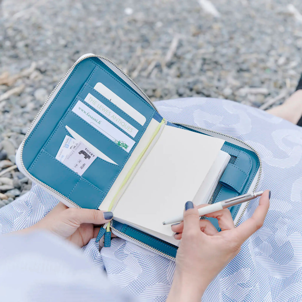 The fabric is a linen with a smooth texture. The interior comes in a deep blue shade, while the two bookmarks are yellow and gray, respectively.