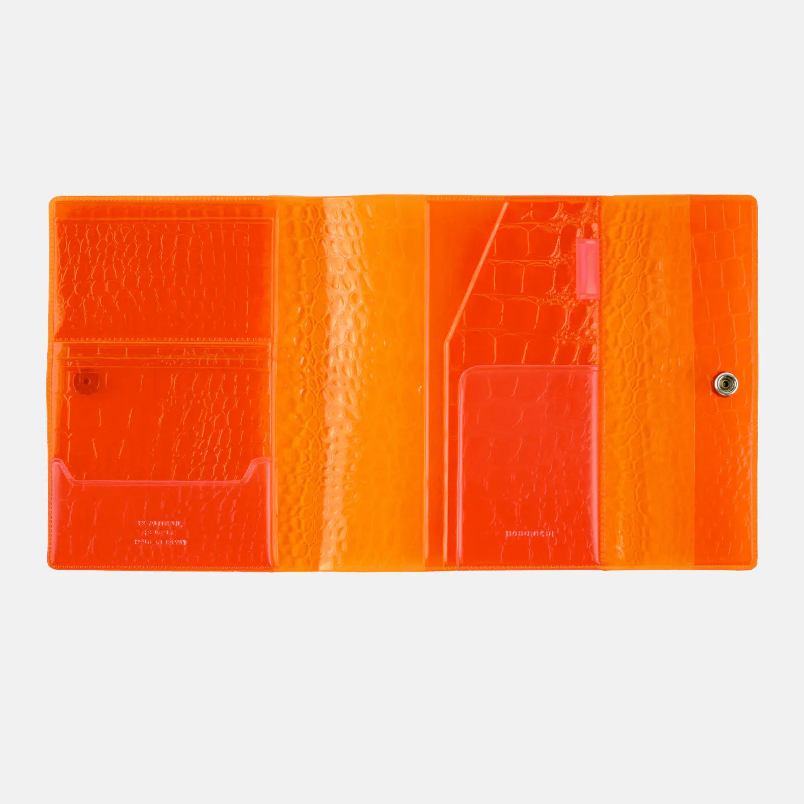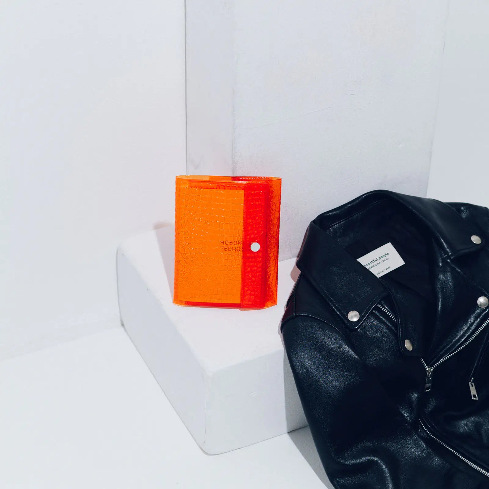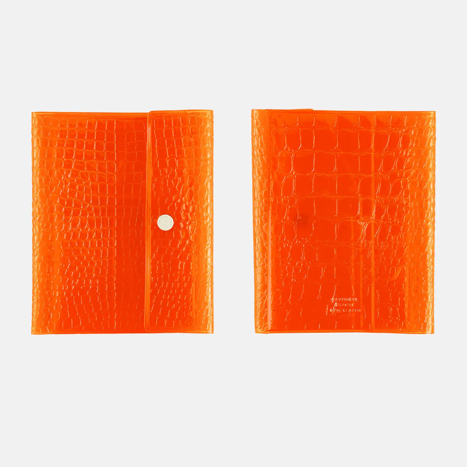 The cover features a crocodile-embossed pattern on PVC. By pairing the transparency of PVC with the embossed texture of natural leather, this design captures beautiful people’s signature sense of playful contrast.