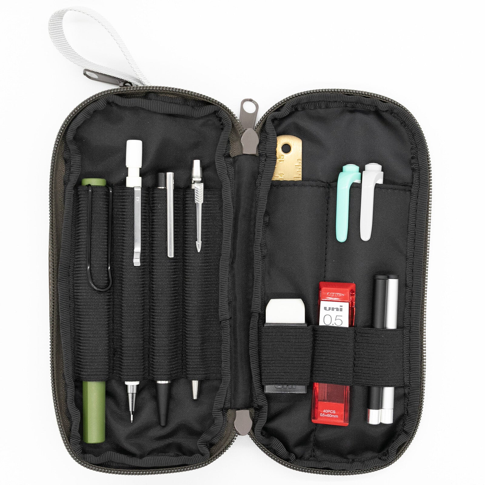 Open it up and everything is exactly where it should be. Elastic loops hold pens, pencils, erasers, lead cases, and small essentials firmly in place, so nothing rattles, tangles, or disappears into the void. It opens fully for clear visibility, making it easy to grab what you need and get on with your work.