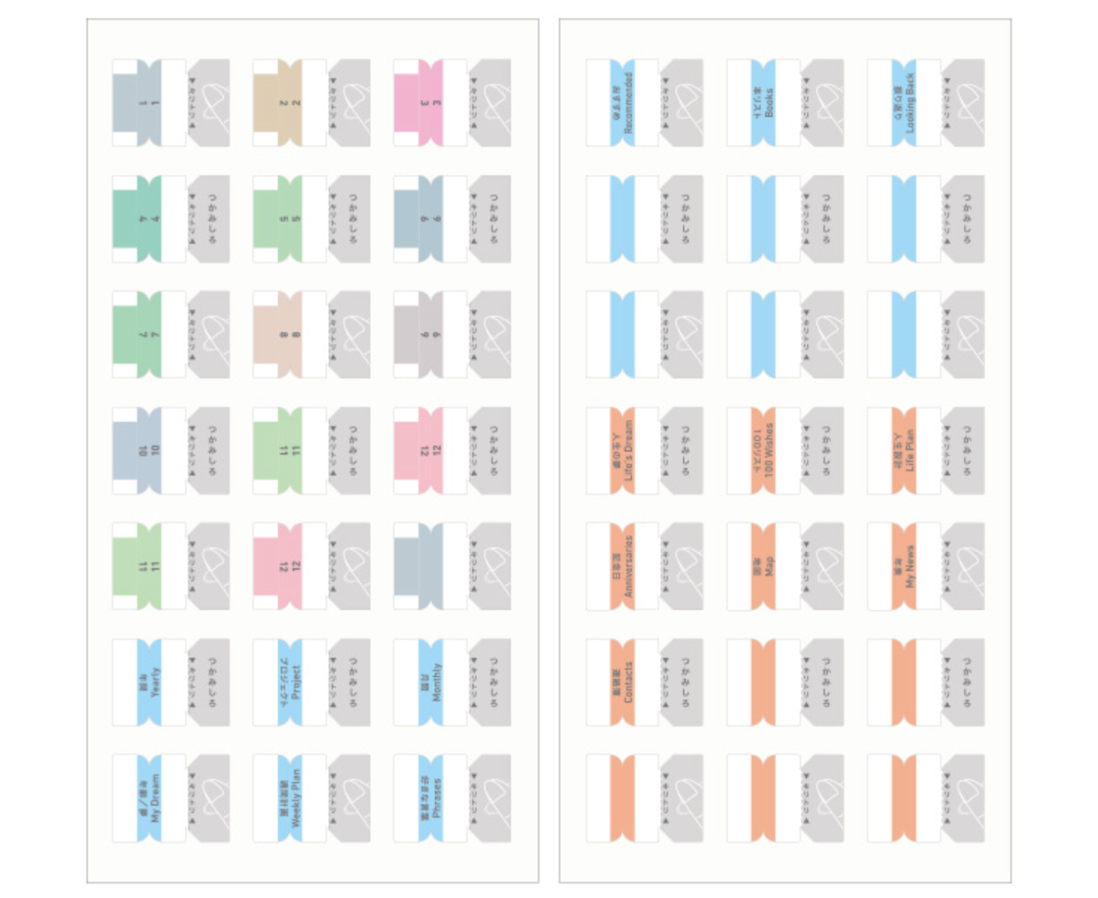 The Kokuyo Jibun Techo Index Tabs – Standard are designed to give you quick access to important sections in your planner. This set includes 2 sheets of stickers, clearly labelled with commonly used titles such as each month, DIARY, and LIFE.