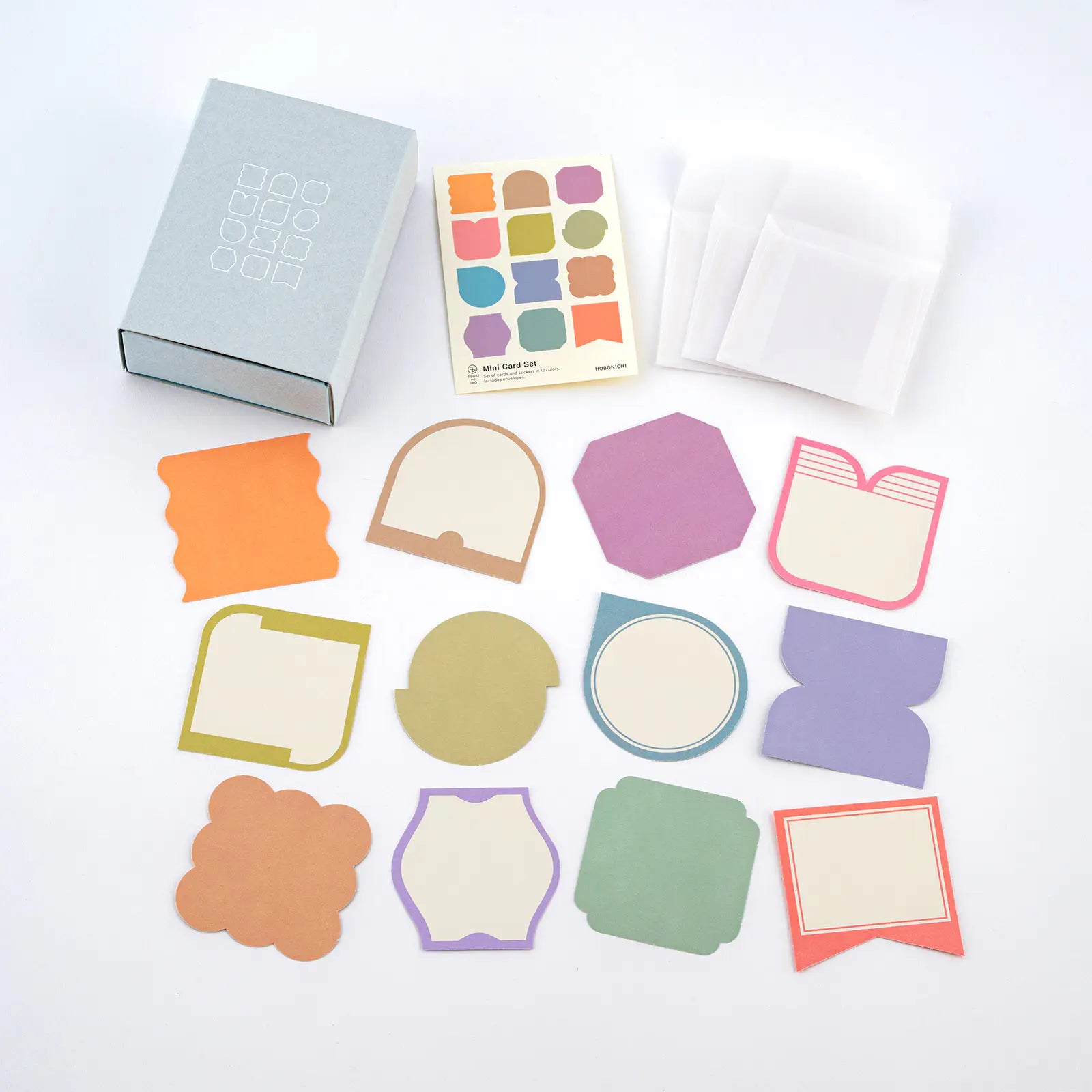 This Mini Card Set includes 12 playful and unique card shapes, with two of each design. The set also comes with a sheet of matching sealing stickers and six translucent envelopes, all packaged in a sleeve-style box decorated with silver foil featuring the shapes of the cards.