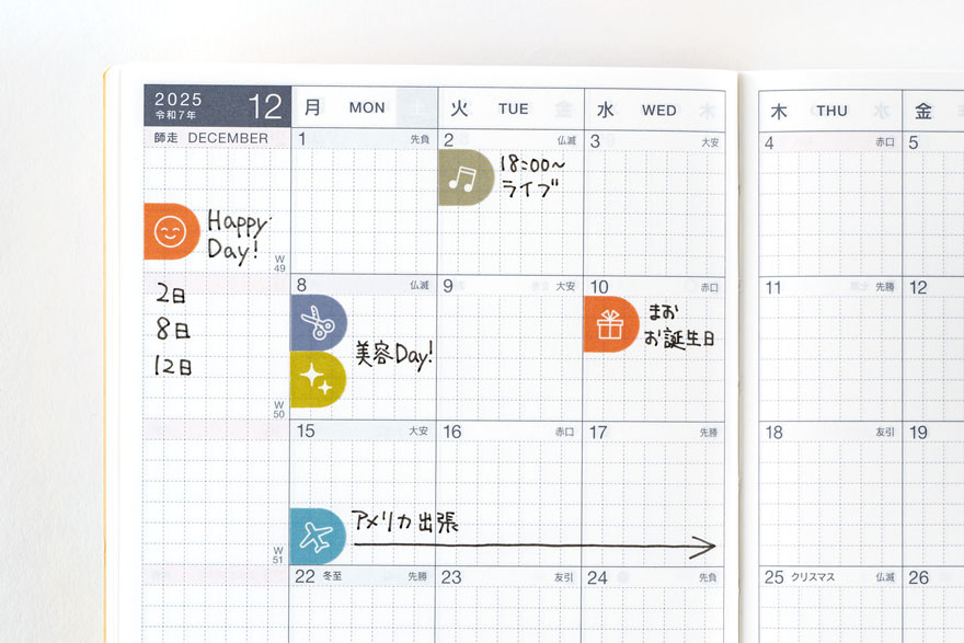 Two sheets are filled with icon stickers—such as presents, food, smiley faces, and airplanes—designed for easy schedule management. If you align them with the left-hand line on your monthly calendar, you can see your plans at a glance.