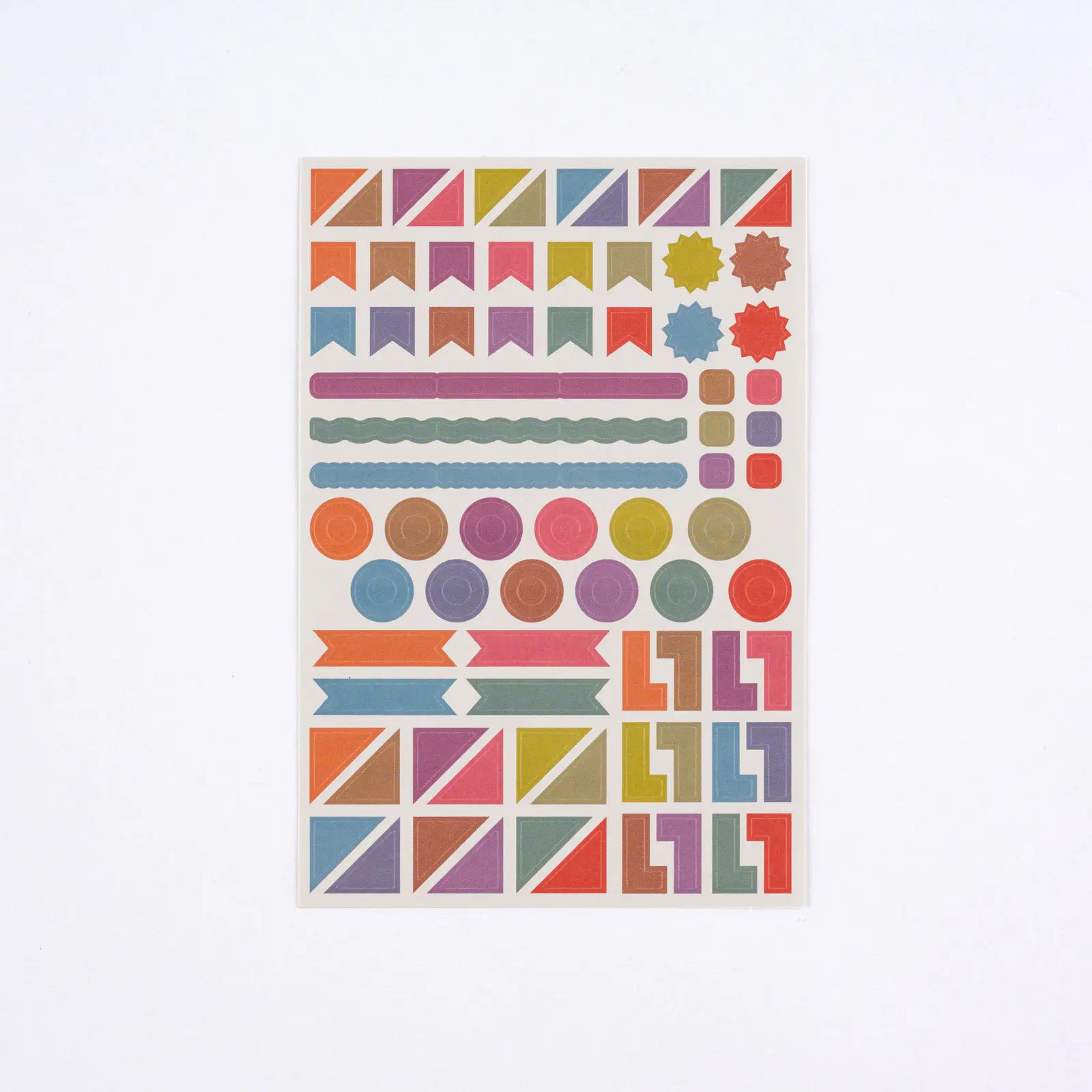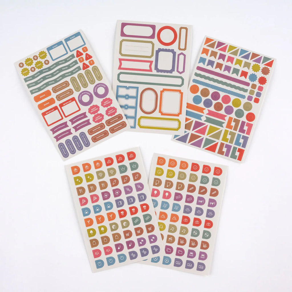 There are also stickers in a variety of shapes like triangles, circles, and ribbons. Use them to make important days stand out or mark longer events like travel with brackets or lines.