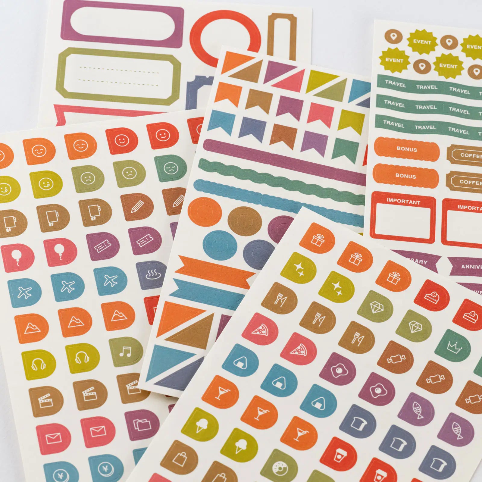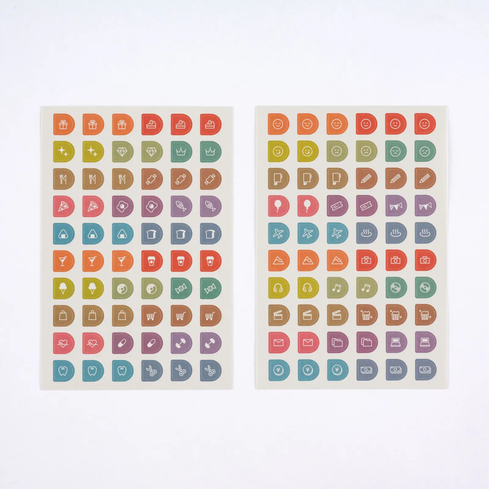 The Sticker Set (Schedule) is a collection of stickers you can use to highlight plans or decorate your monthly and daily pages in a fun way. Made with a smooth, matte material, the stickers can be written on with a ballpoint pen or other writing tools.