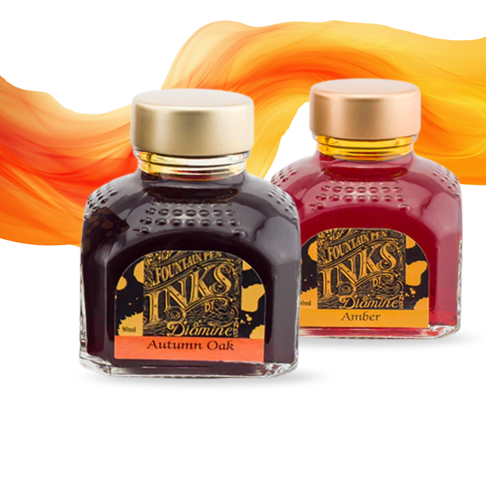 Diamine fountain pen inks offer one of the broadest and most well-loved colour ranges in the fountain pen world. The collection includes dependable everyday shades like black, blue, and blue-black, as well as expressive reds, greens, purples, browns, and softer pastel tones. We've grouped all of the Orange and Orange leaning colours, to make choosing your ideal shade, easier.