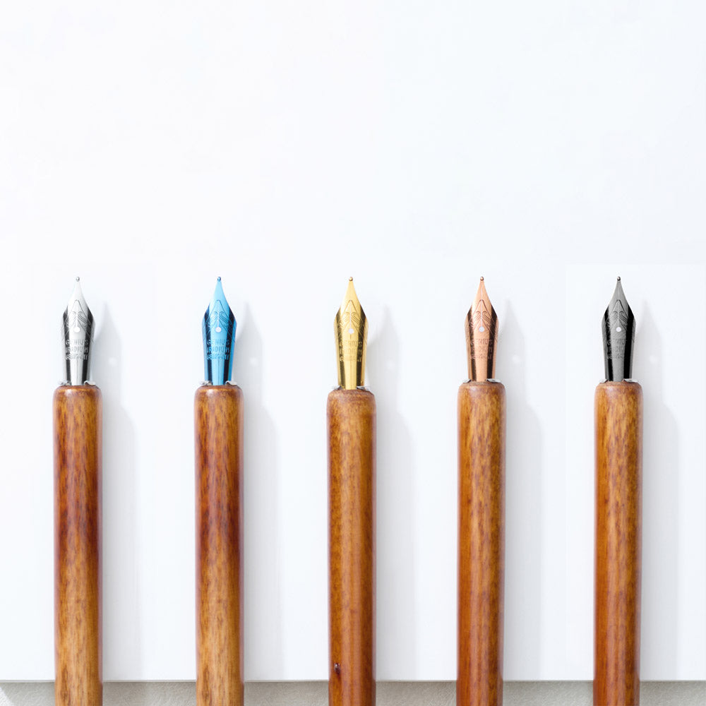 Each nib is engineered to resist splaying and to hold ink generously, allowing for longer writing sessions with fewer interruptions for re-dipping. The result is a smooth, consistent experience that keeps you immersed in your thoughts rather than hovering over the ink bottle. Housed in a compact round metal tin, the set travels well and stays neatly organised when not in use.