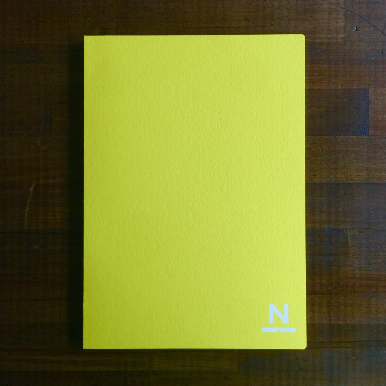 Nouto Nonble N notebook with yellow cover on wooden surface.