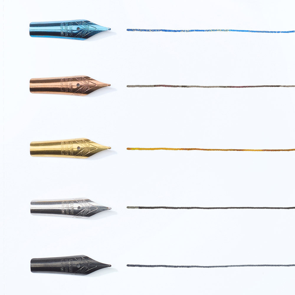 Each nib is engineered to resist splaying and to hold ink generously, allowing for longer writing sessions with fewer interruptions for re-dipping. The result is a smooth, consistent experience that keeps you immersed in your thoughts rather than hovering over the ink bottle. Housed in a compact round metal tin, the set travels well and stays neatly organised when not in use.