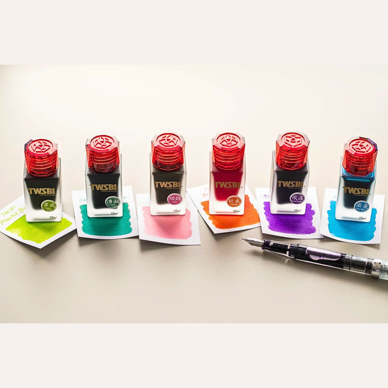 Each colour comes housed in a handsome, square-profiled frosted glass bottle, holding a perfectly manageable 18ml of ink—ideal for writers and collectors who prefer variety over vast quantities. The translucent dark red cap is subtly branded with the TWSBI logo, adding a restrained finishing touch that feels both modern and traditional.