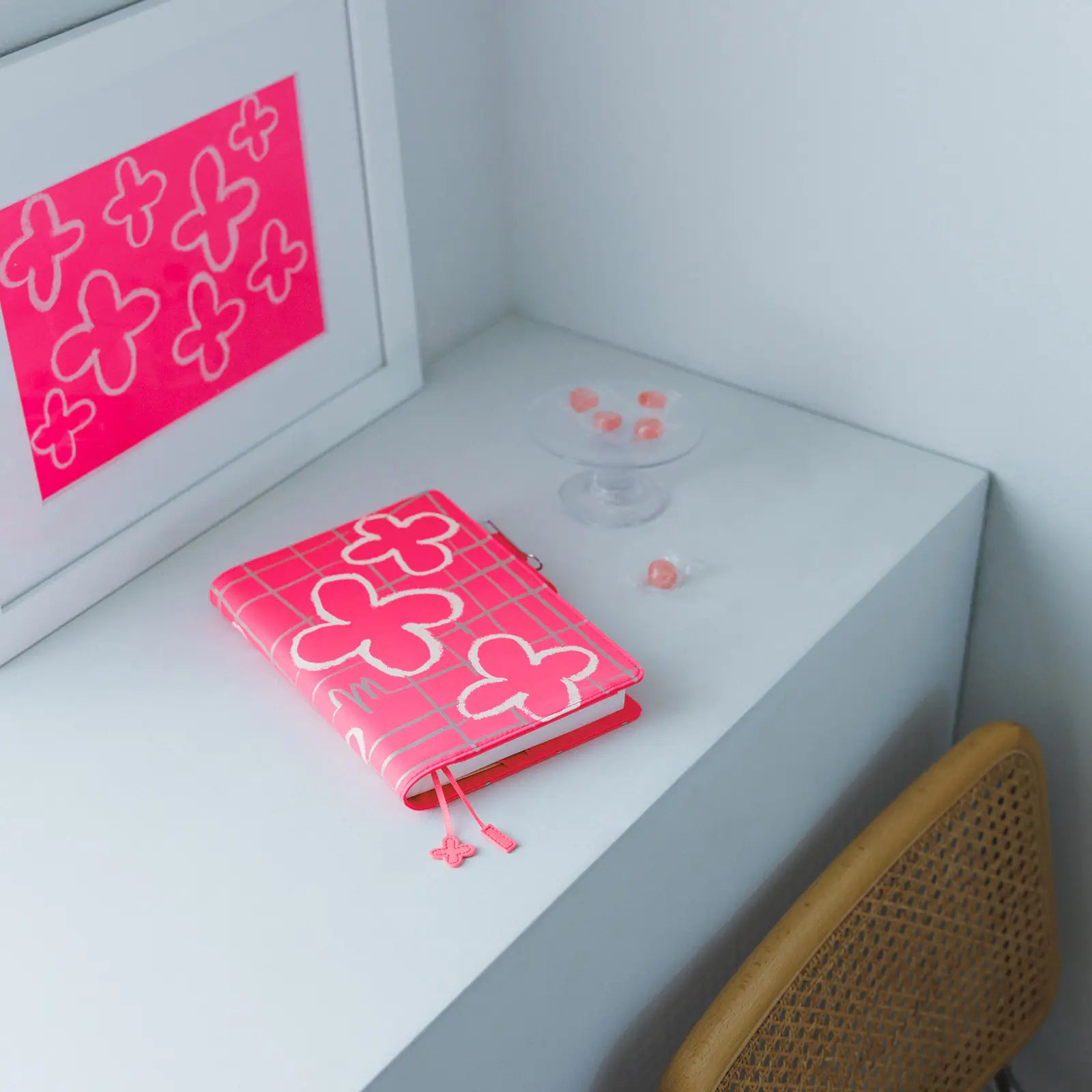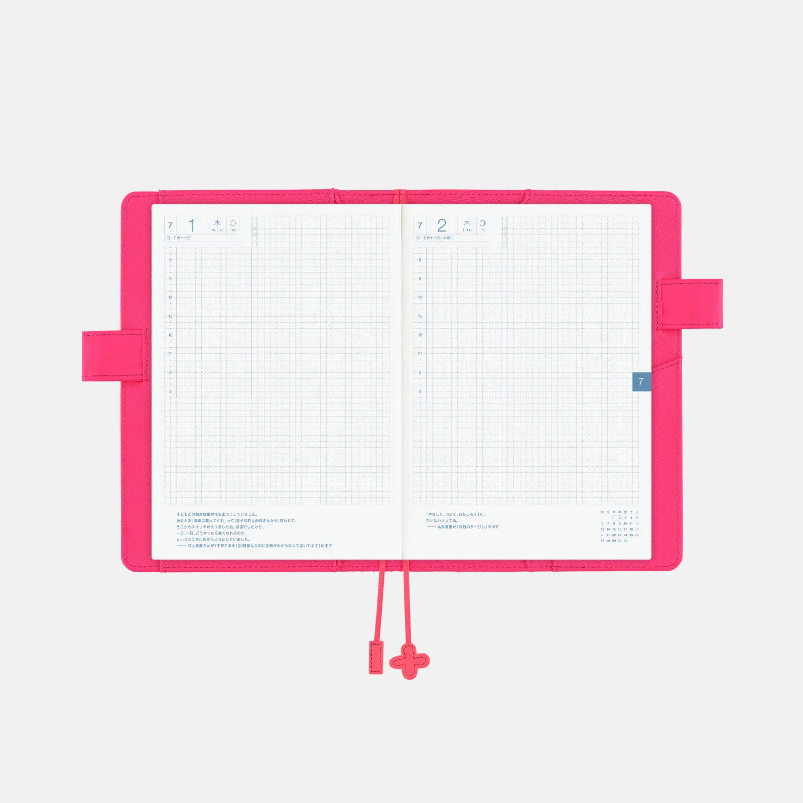 One of the two bookmark charms also features a flower design by Matsubayashi. The charm is finished in the same vivid pink as the cover.
