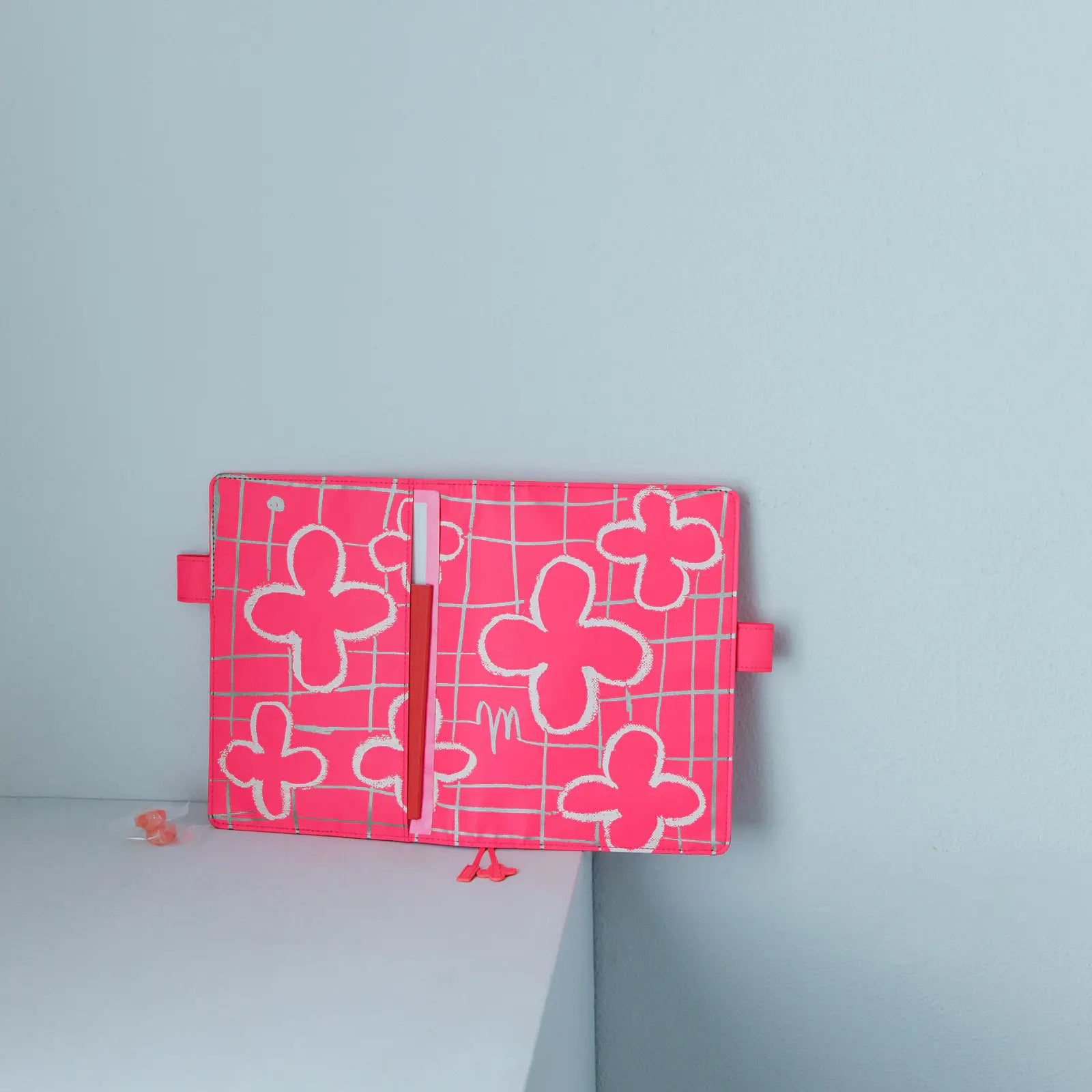 The interior features the same pink color as the cover. On the upper part of the right-side, you’ll find two flowers printed in white ink.
