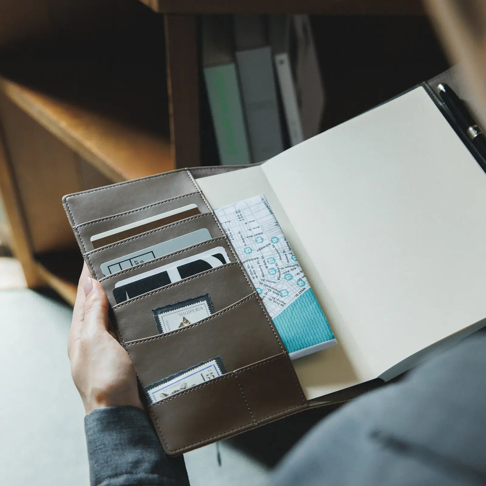 The pen hook holds a pen by its clip, while still maintaining the cover’s clean, refined silhouette when closed.