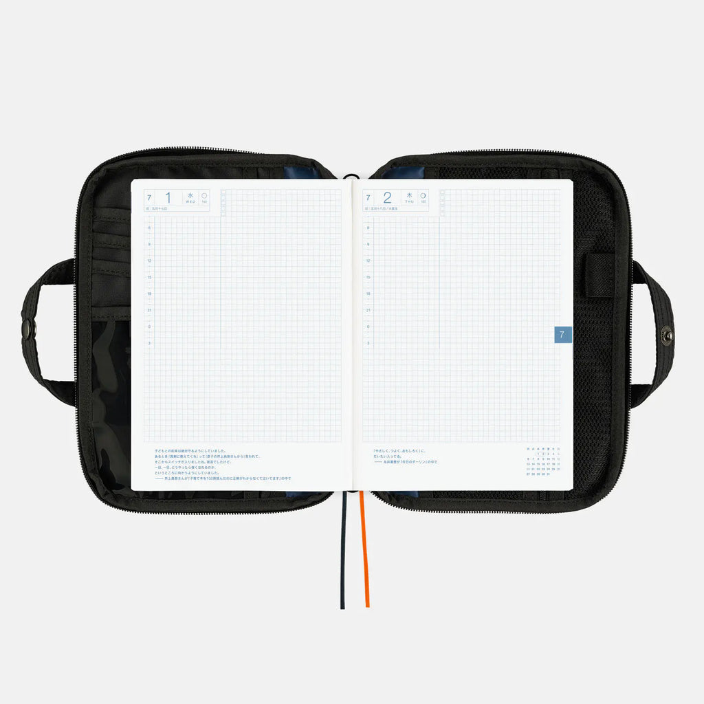 The design lets you take the cover out on a stroll, like you would a small bag, and you can even easily take the things you need that day with you along with your techo. The A5 Cousin size comes in black. This sleek and refined look is a standard color for Yoshida & Co.