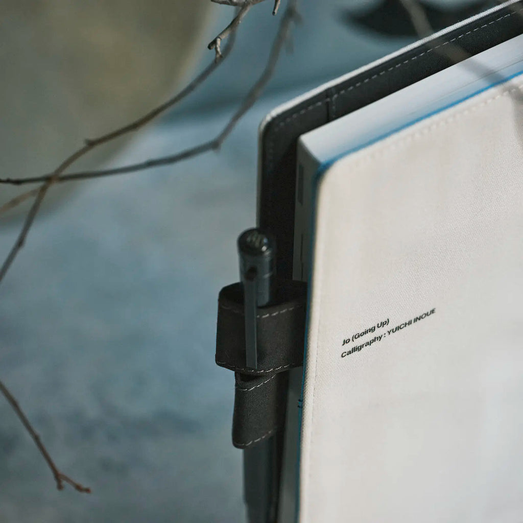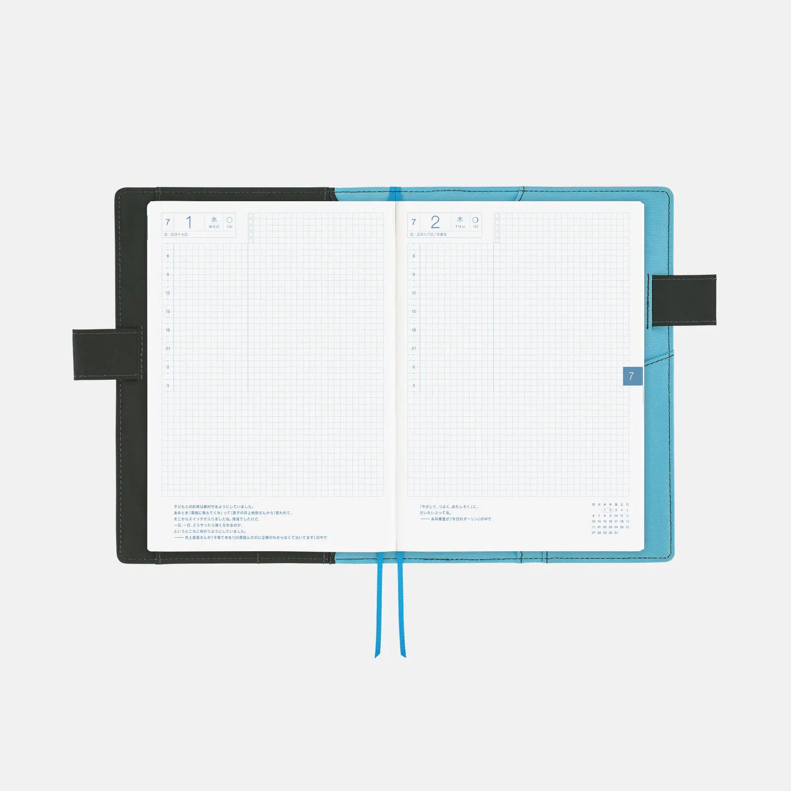 The interior features a dignified ink black paired with a sky blue reminiscent of a clear day. A slender, vivid blue bookmark serves as a bright accent when the cover is closed.
