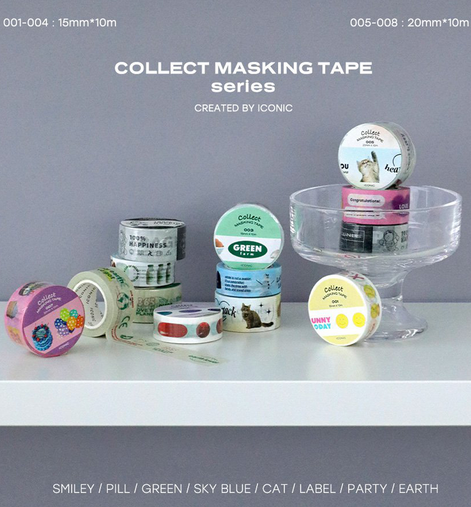 Add a nostalgic twist to your crafts with the Iconic Collect Masking Tape 20mm. This beautifully designed series features four charming themes – Cat, Label, Party, and Earth – each filled with vintage-inspired graphics and delightful details. The 20mm width is perfect for creating decorative borders, eye-catching headlines, or layered accents in your journals, planners, and gift wrap. Whether you’re crafting, scrapbooking, or simply adding a touch of retro flair to your stationery, this tape makes every project feel uniquely personal and endlessly creative.