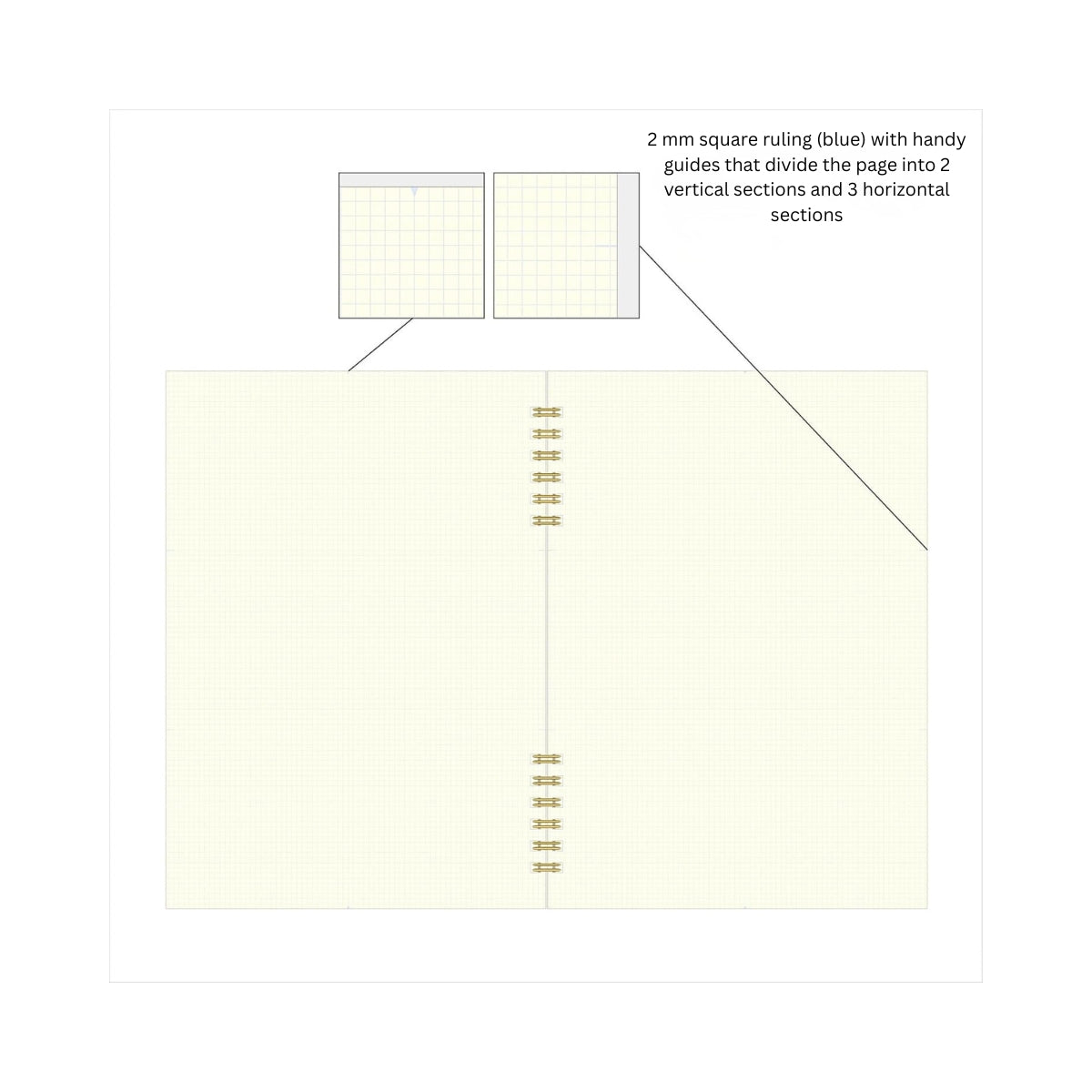 The 2mm grid strikes a rare balance. It offers structure without severity, guiding your notes while preserving the freedom of a plain page. Subtle page-dividing guides allow you to split each sheet vertically and into three horizontal sections — ideal for organising projects, schedules or thoughtful ramblings. The grid print is gentle on the eyes, never intrusive.
