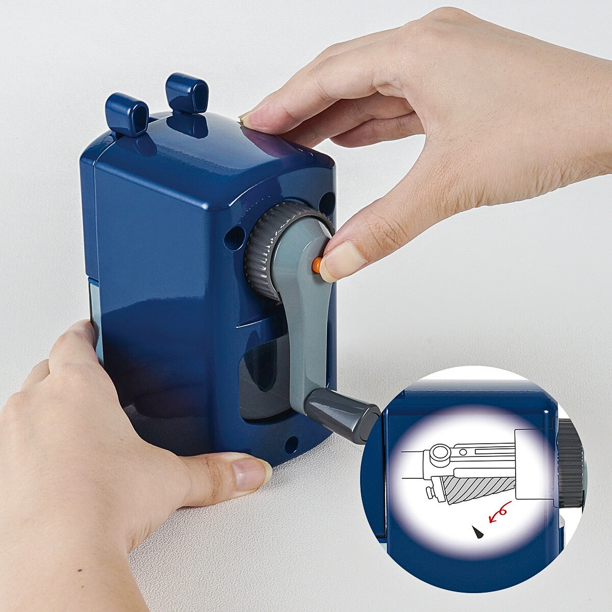 The “Steering Handle Anti-Displacement Lock” prevents the handle from slipping out due to vibration, ensuring smooth, uninterrupted sharpening. The triangular grip holds pencils securely, while the ergonomic knob transmits force efficiently, making sharpening feel controlled rather than strenuous.
