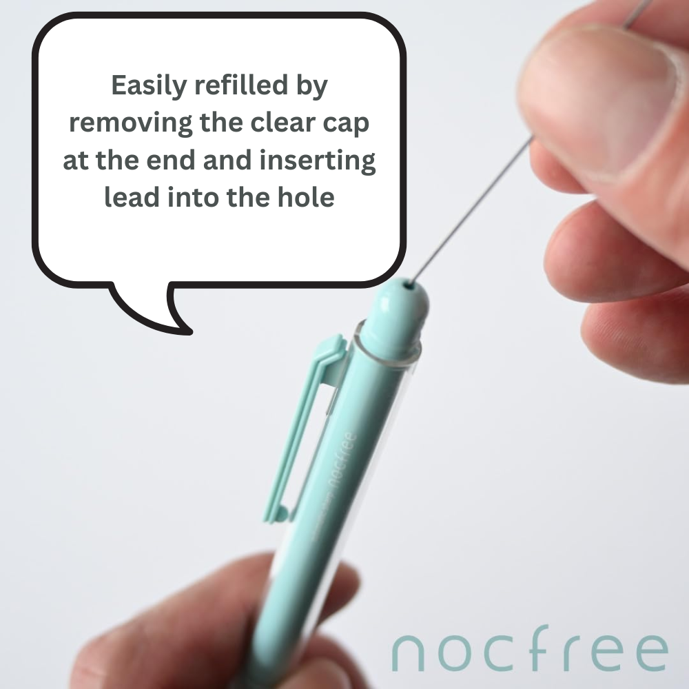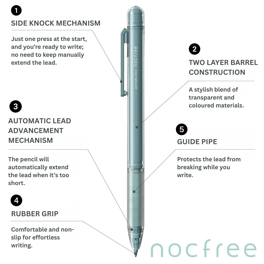 Enjoy uninterrupted writing with the Sun-Star Nocfree Mechanical Pencil —a beautifully engineered pencil that merges smart technology with modern aesthetics. Its innovative auto-advancing lead system means no more constant clicking. Just one side 'knock' to start, and from there, the pencil feeds lead automatically with every touch of the tip to paper. Did you know that in Japan, the side click mechanism is known as a 'Knock' hence the 'NocFree' pencil - one click is all you need for a smooth, uninterrupted writing experience.