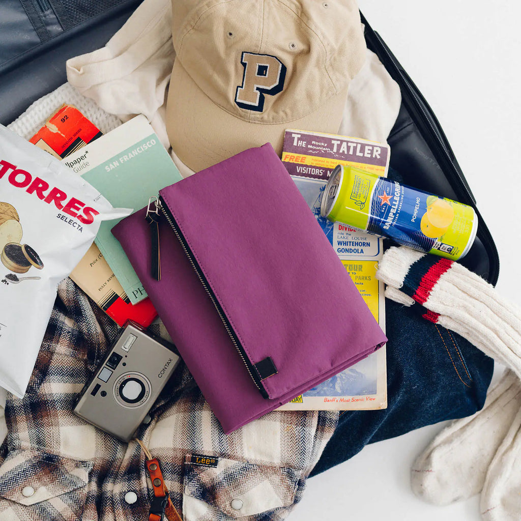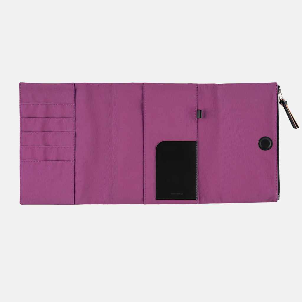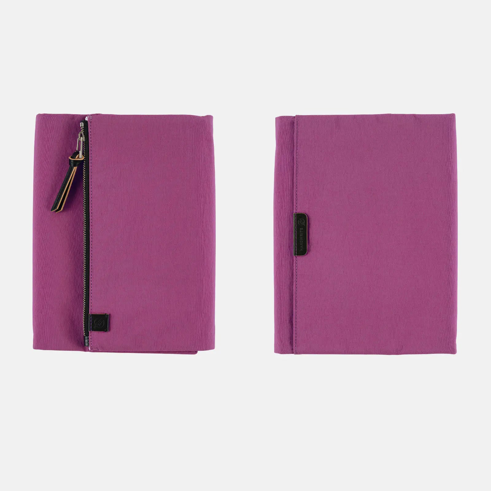 Its standout feature is the generously sized pocket, but its overall appearance remains clean and minimal. The aim was effortless elegance, something that looks sharp without being flashy. Adding a subtle pop is the reddish-purple color. It’s eye-catching yet refined, with a mature tone. Though it folds into thirds and fastens with a magnetic closure, the cover is light in hand. The material is a soft nylon with a sophisticated sheen.