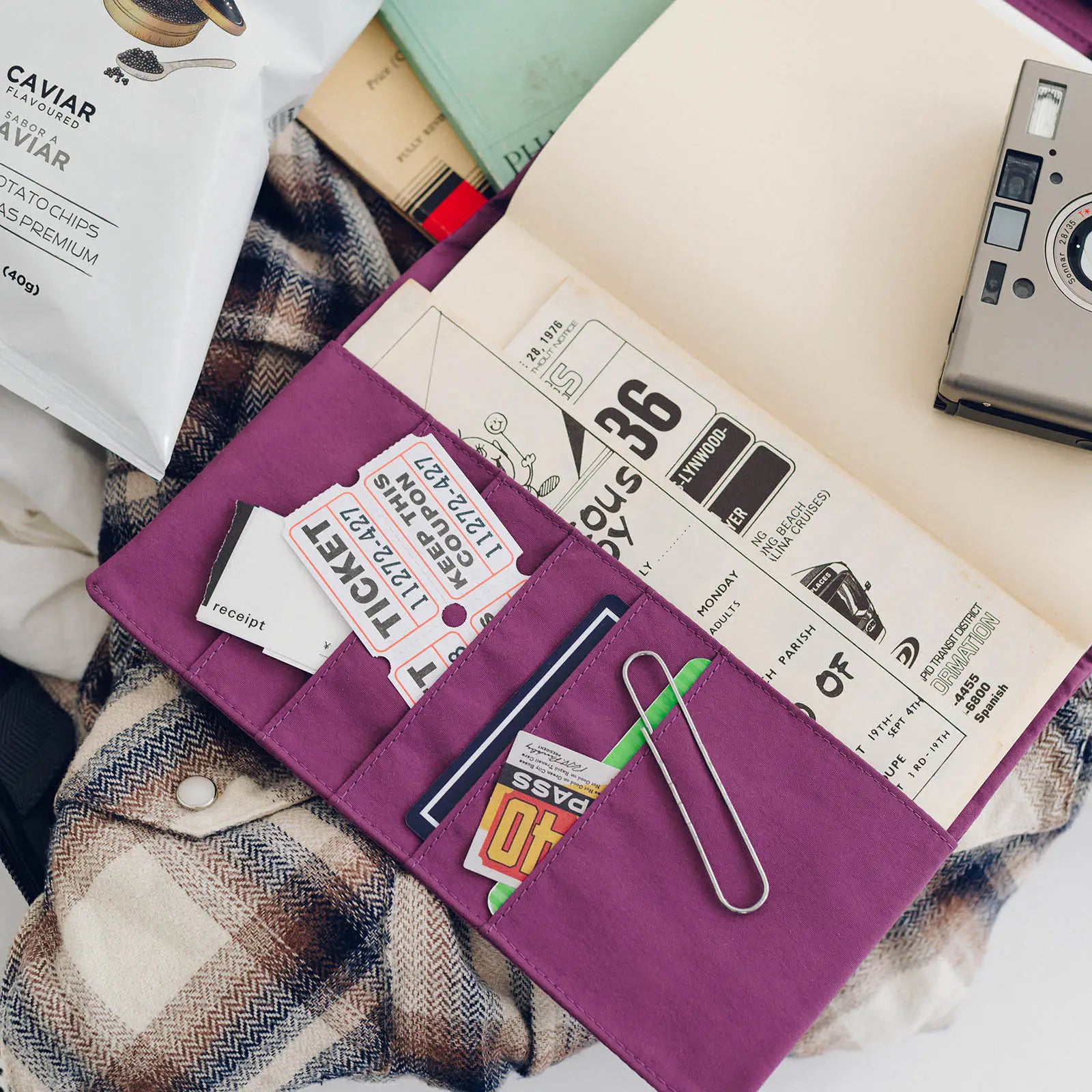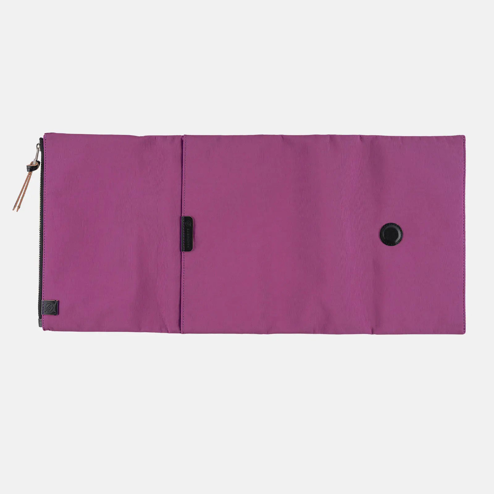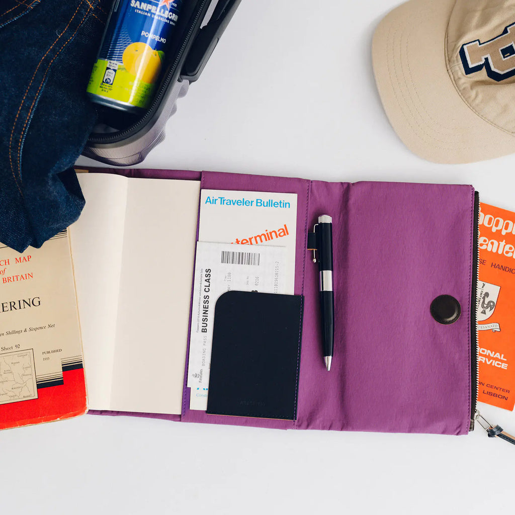 Its standout feature is the generously sized pocket, but its overall appearance remains clean and minimal. The aim was effortless elegance, something that looks sharp without being flashy. Adding a subtle pop is the reddish-purple color. It’s eye-catching yet refined, with a mature tone. Though it folds into thirds and fastens with a magnetic closure, the cover is light in hand. The material is a soft nylon with a sophisticated sheen.