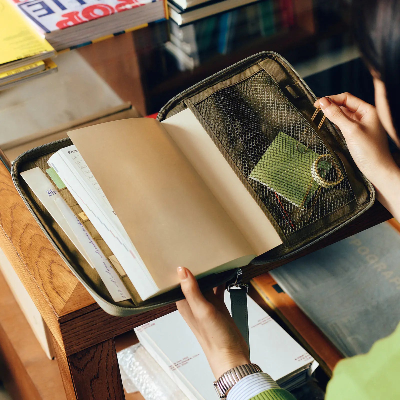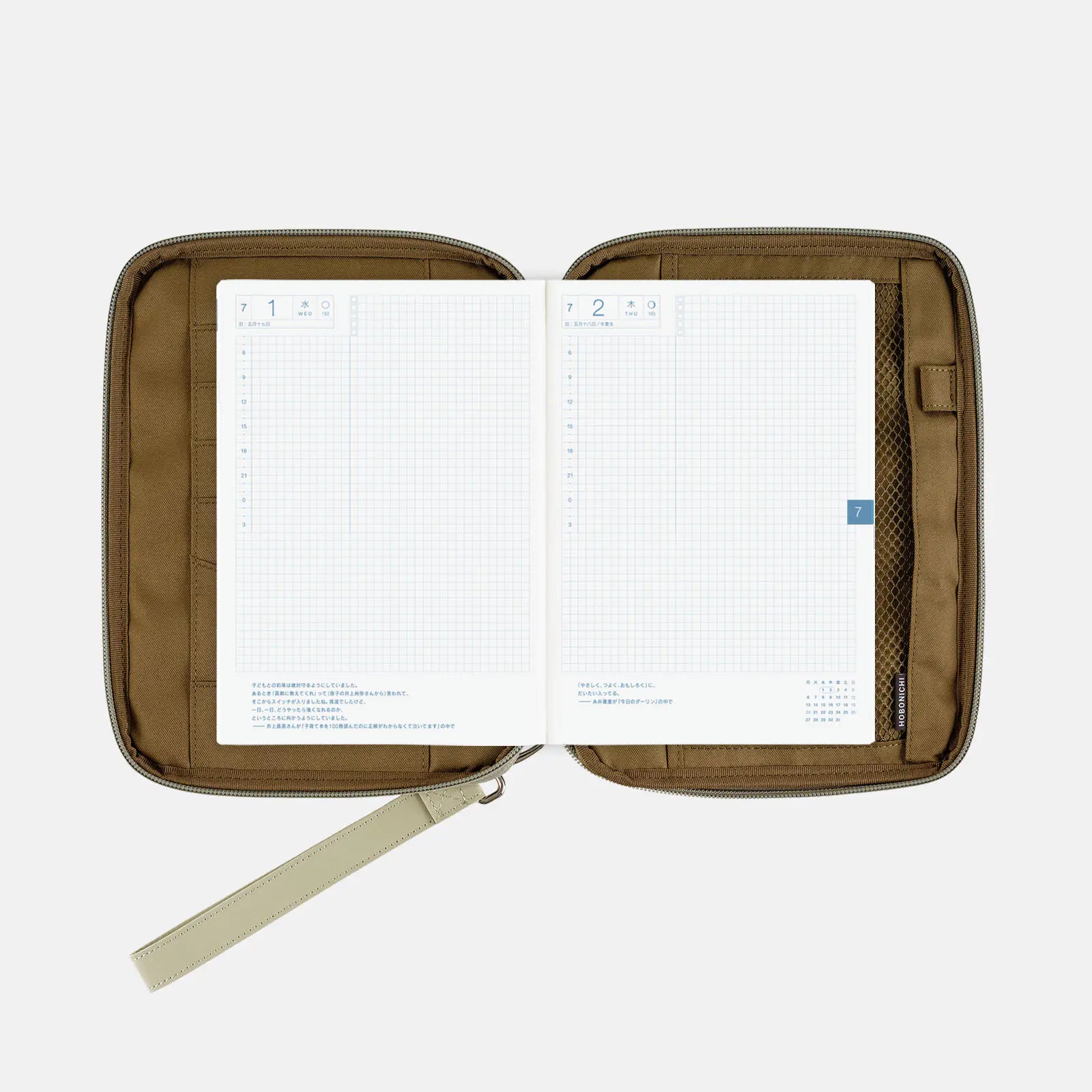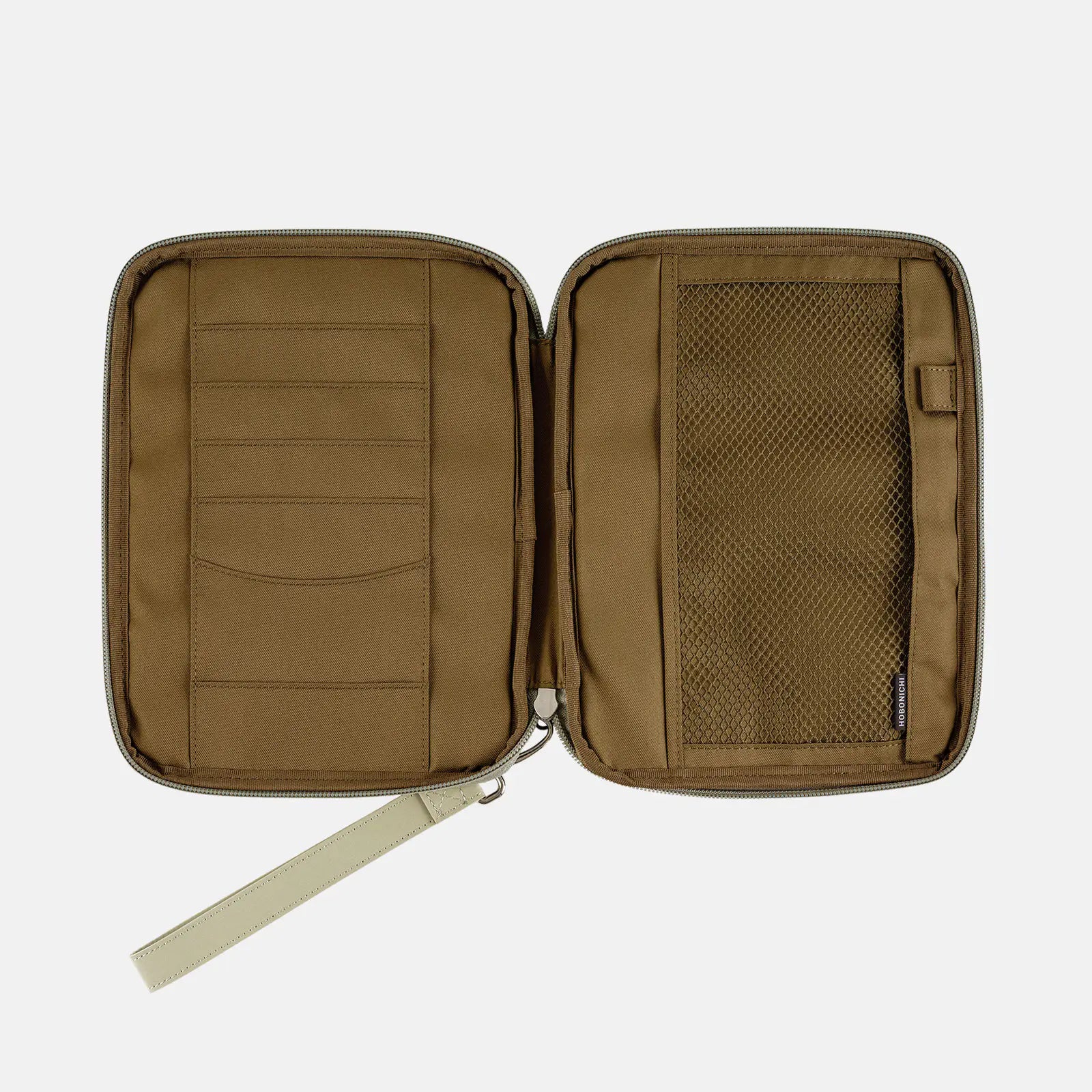 The interior is a deep olive green. It features a mesh pocket, and the pen hook holds a pen by its clip. Even when closed, the cover maintains a neat, sleek look.