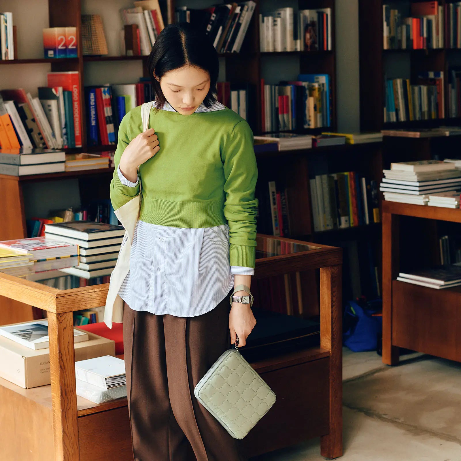 The soft sage green color gives it a calm and composed look, while the overall shape and materials keep things casual and approachable.