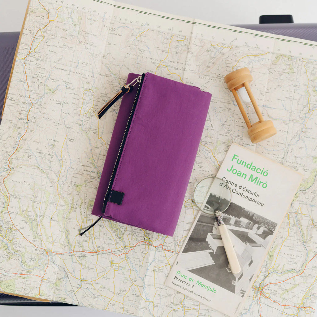 Its standout feature is the generously sized pocket, but its overall appearance remains clean and minimal. The aim was effortless elegance, something that looks sharp without being flashy. Adding a subtle pop is the reddish-purple color. It’s eye-catching yet refined, with a mature tone. Though it folds into thirds and fastens with a magnetic closure, the cover is light in hand. The material is a soft nylon with a sophisticated sheen.