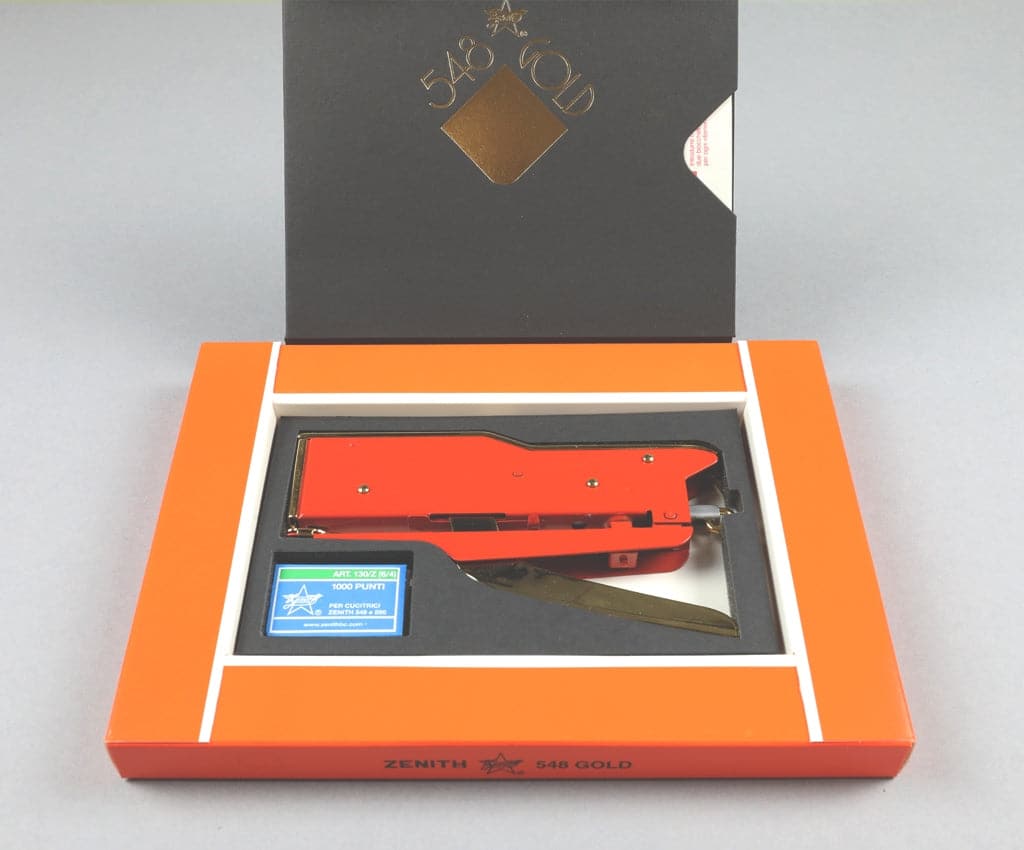 The Zenith Stapler 548 in gold is a stunning tool to always keep close at hand on your desk. Like all Zenith products, this stapler is high quality, durable and practical, while also featuring an extraordinary finish: the body is painted in a shiny orange-red colour, combined with other external components finely finished with gold-plated brass. Comes in a smart box, so it makes a perfect gift for anyone who enjoys keeping their papers organized, whether at home or in the office. Contains a box of Zenith staplers.