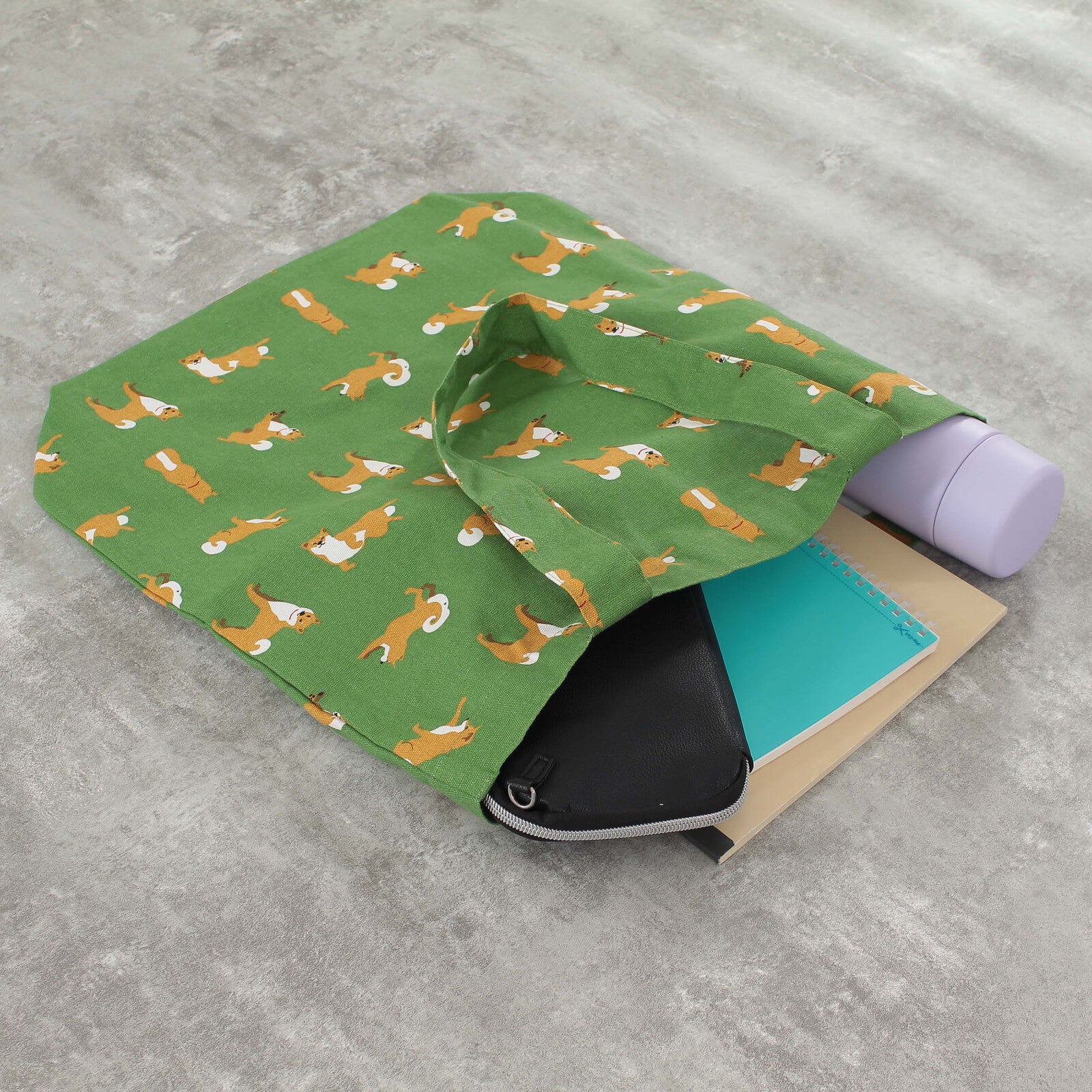 Step out in style with our Playful Shiba Parade Cotton Tote Bag, a celebration of Japan's most beloved canine set against a refreshing green canvas. This tote is peppered with a variety of Shiba Inus in playful poses, each one capturing the cheerful spirit of these friendly companions.