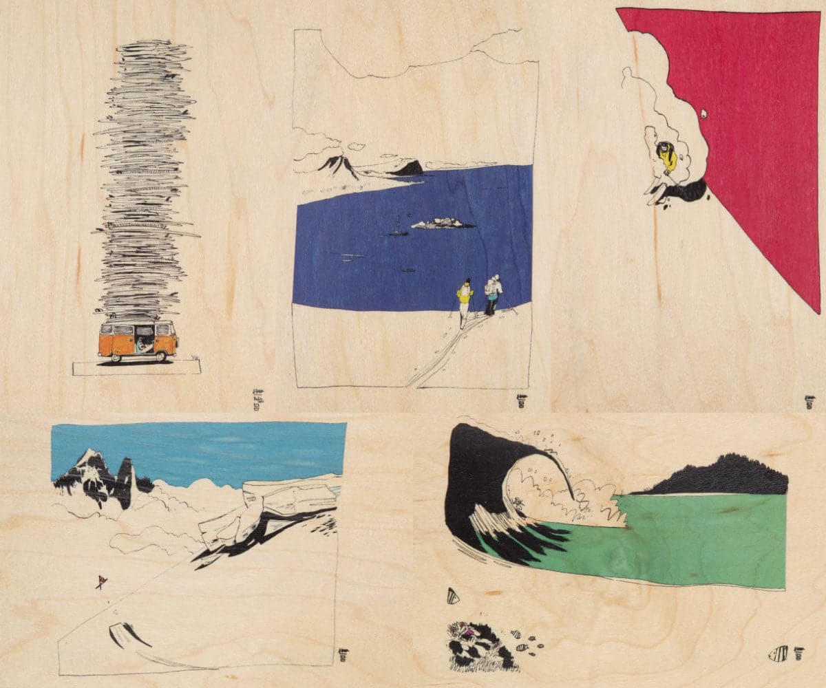 Woodhi Wooden Postcard to post, offer and collect. Simon Charrière created this series highlighting his passions: powder, jumps, hiking, as well as waves, surfing ...