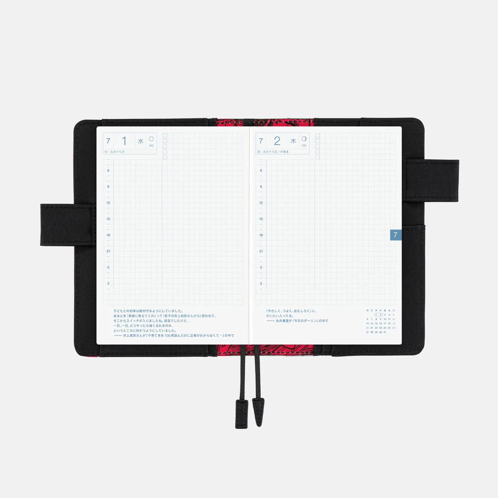 At the top of the back cover is an English message—an edited version for the Hobonichi Techo of a line spoken by a male character in the manga, describing Tomie’s irresistible charm. Her clear eyes, sweetly tart voice, and the fragrance that lingers on her skin...no one could possibly compare to Tomie.